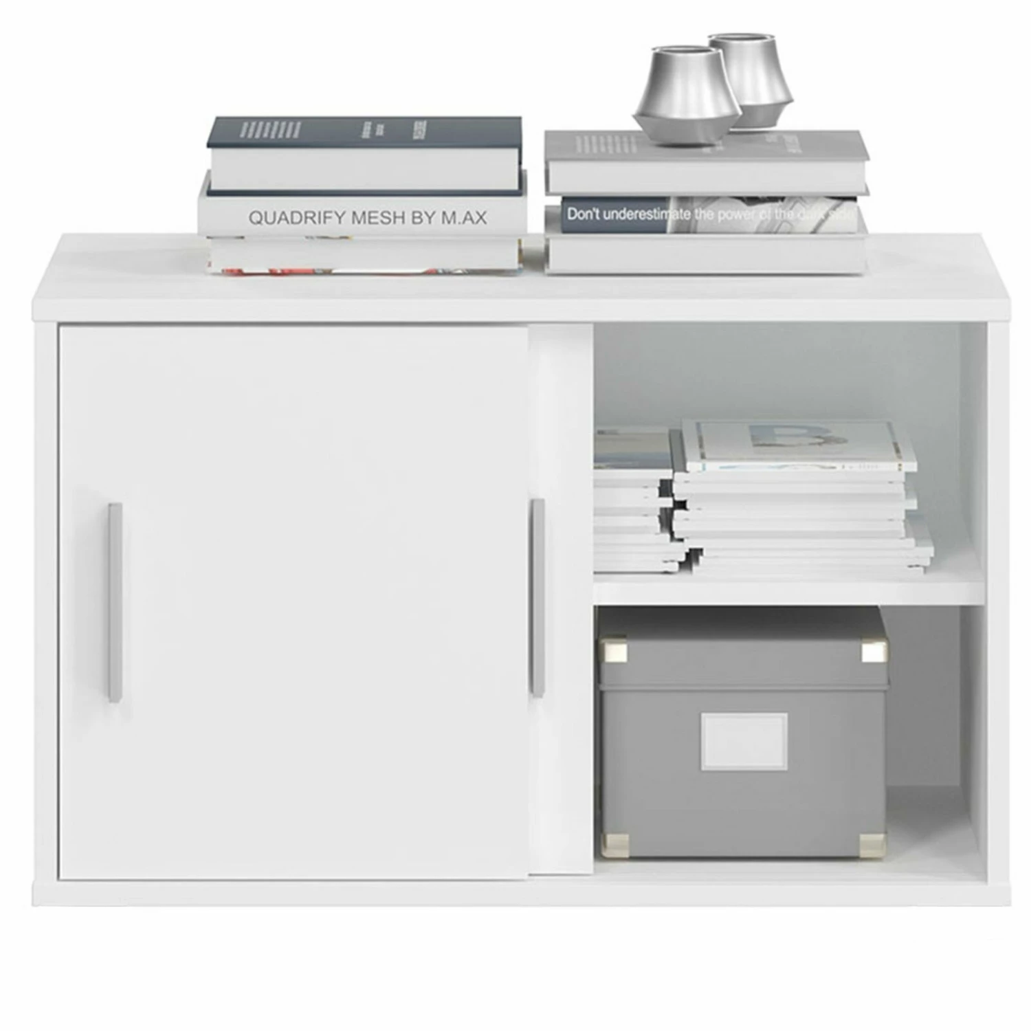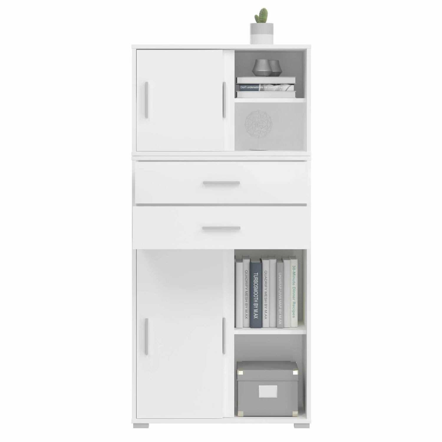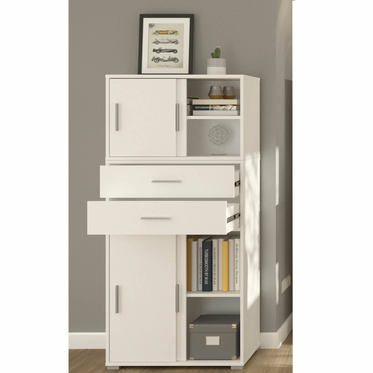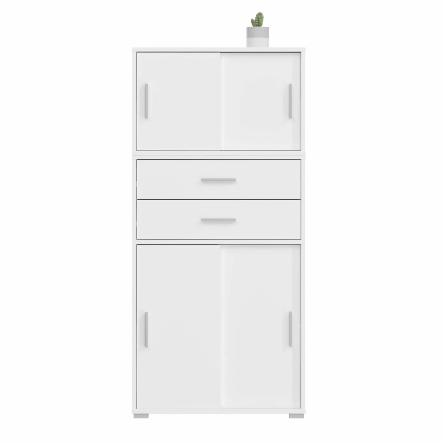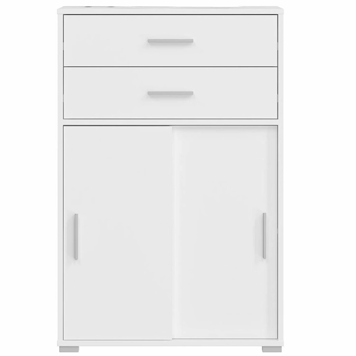 Dieses 2-teilige Schrank-Set bietet Ihnen viel Stauraum und punktet mit schlichtem Design. Das Set ist mit vier Schiebetüren und zwei Schubkästen ausgestattet. Hinter den Schiebetüren je Schrank befinden sich, getrennt durch einen Einlegeboden, zwei großzügige Fächer. Die Schiebetüren lassen sich bequem Öffnen und Schließen – auch bei engeren Platzverhältnissen. Die Griffe aus Kunststoff in Aluoptik runden das moderne Design ab.