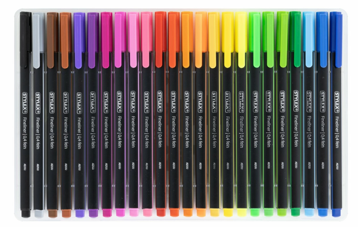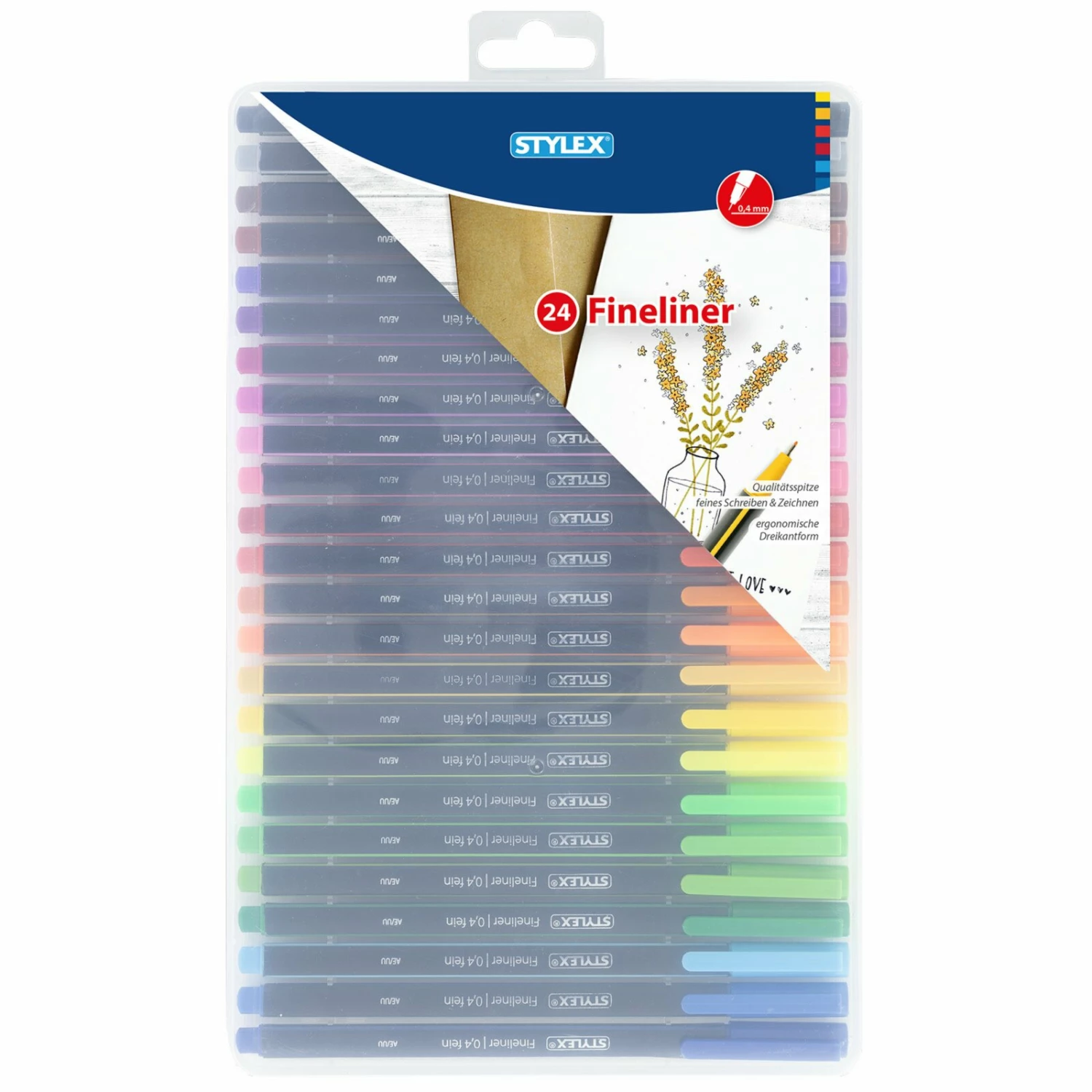 Mit diesem Fineliner-Set bist du bestens ausgestattet! Die Qualitätsspitze, sowie die Strichstärke von etwa 0,4 mm sorgen für feines Zeichnen und Schreiben. Im wiederverschließbaren Etui finden die 24 verschiedenfarbenen Stifte wieder ihren Platz. Zudem sorgt die ergonomische Dreikantform für entspanntes Zeichnen.