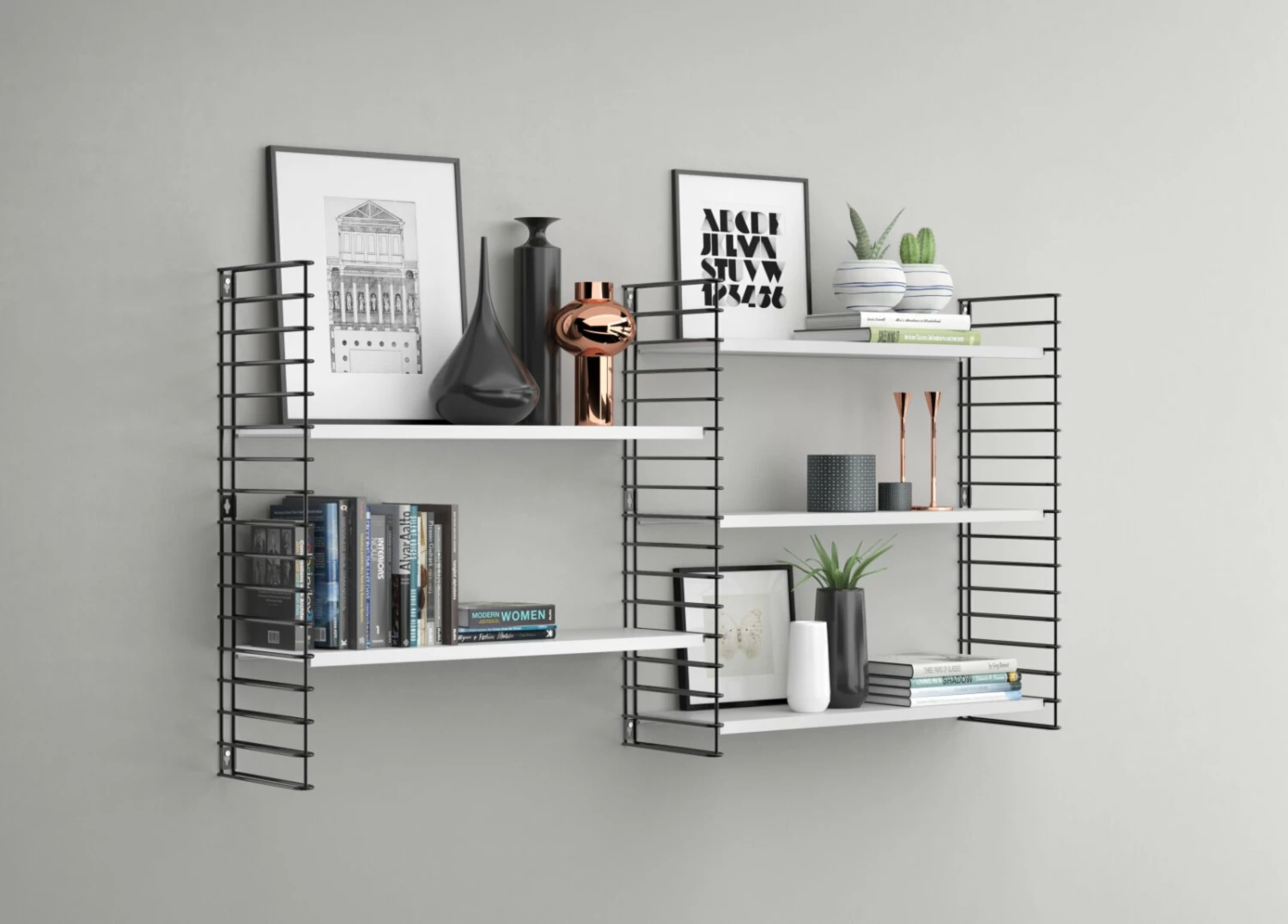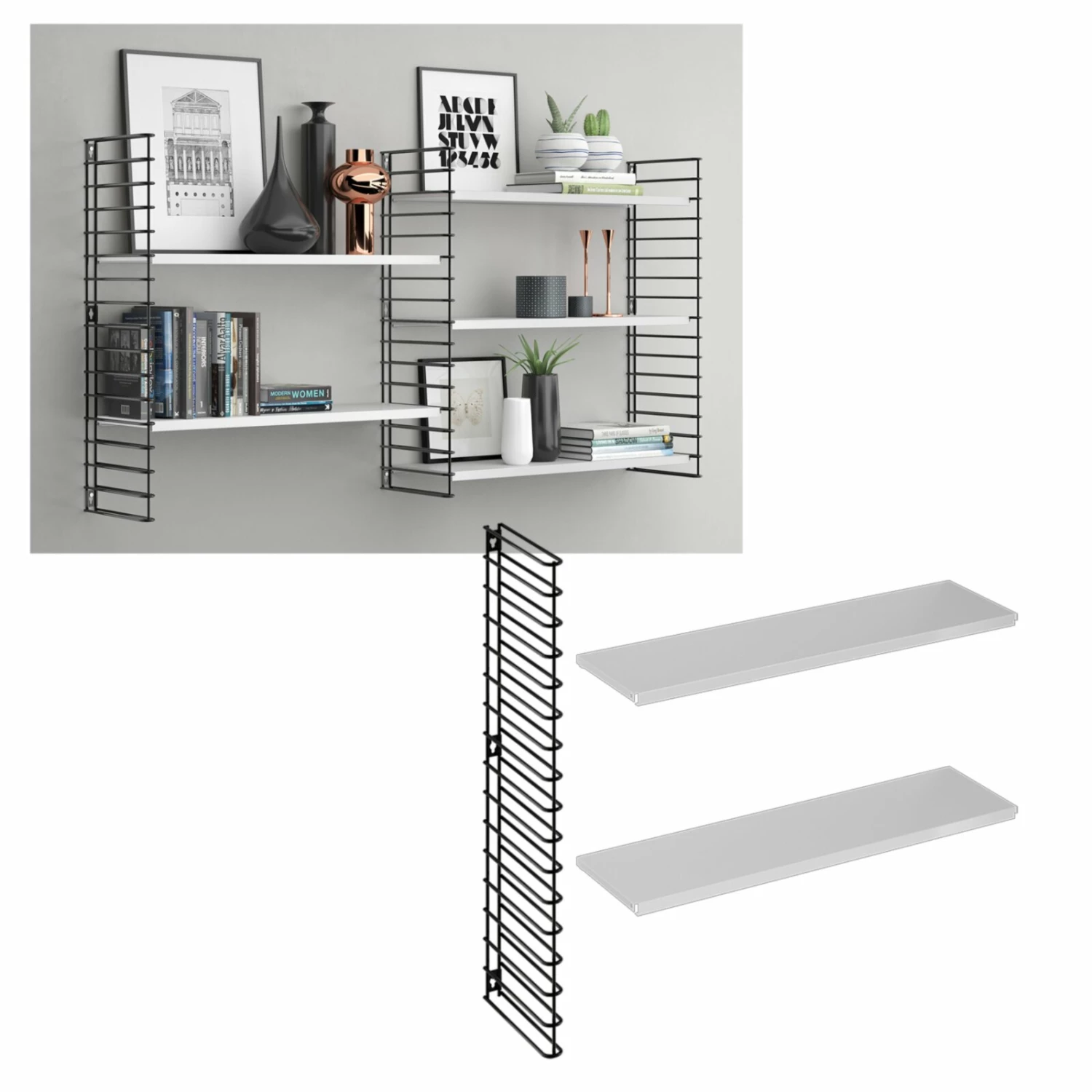 Sie haben Ihr Wandregal aufgehangen und sind zufrieden doch Ihnen fehlt noch ein wenig mehr Platz? Dann ist dieses Erweiterungs-Set mit schwarzem Seitengitter und weißen Regalböden genau richtig. Es besteht aus Epoxy-beschichtetem Metall und passt perfekt zu Ihrem Ausgangsschrank. Und das Endergebnis kann sich sehen lassen.