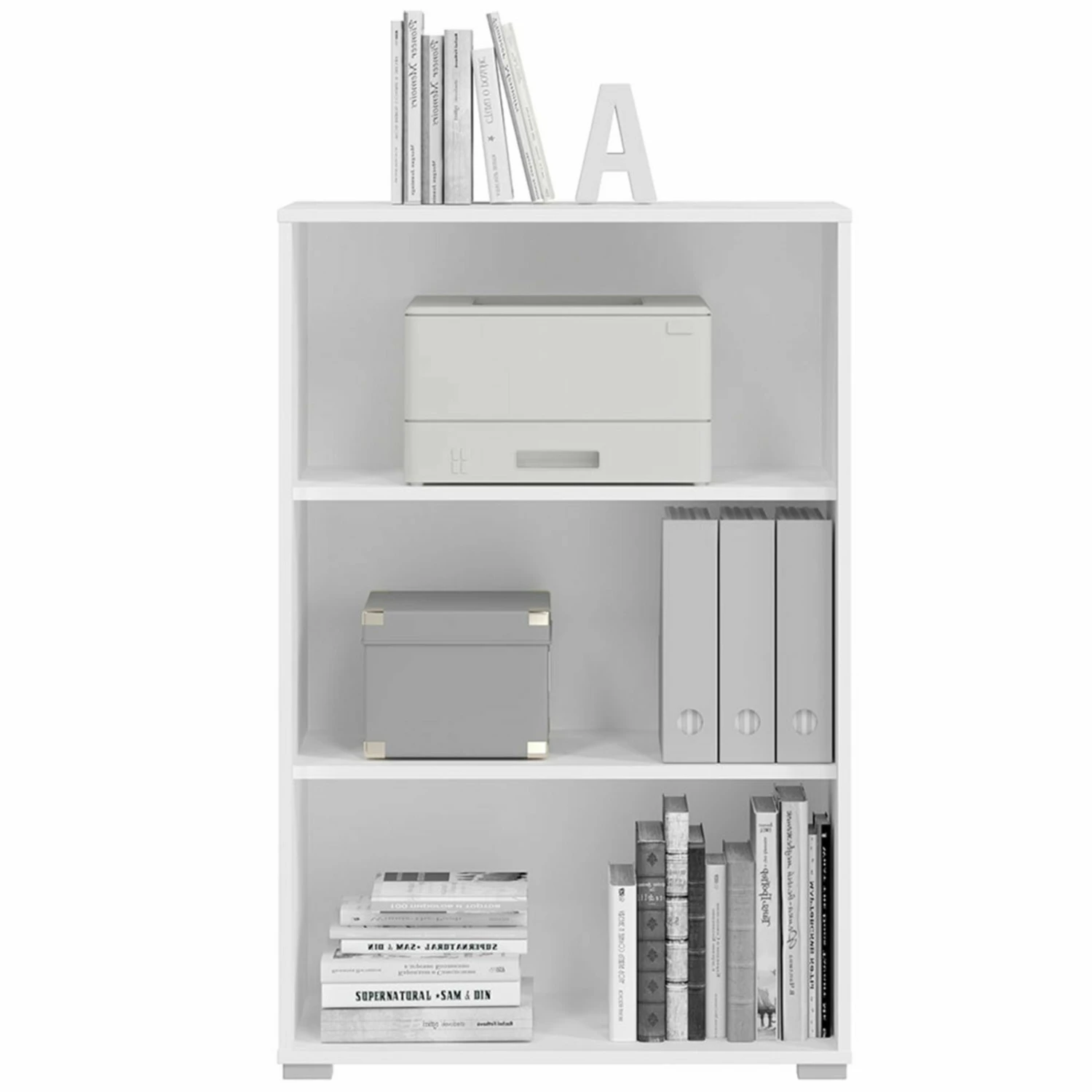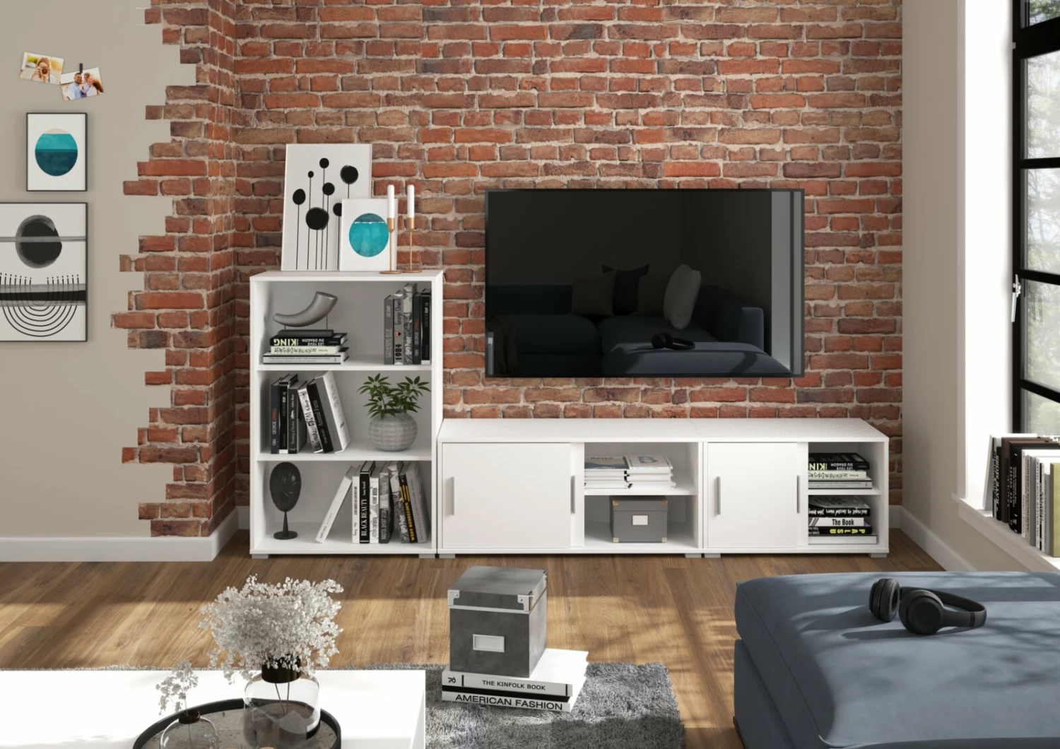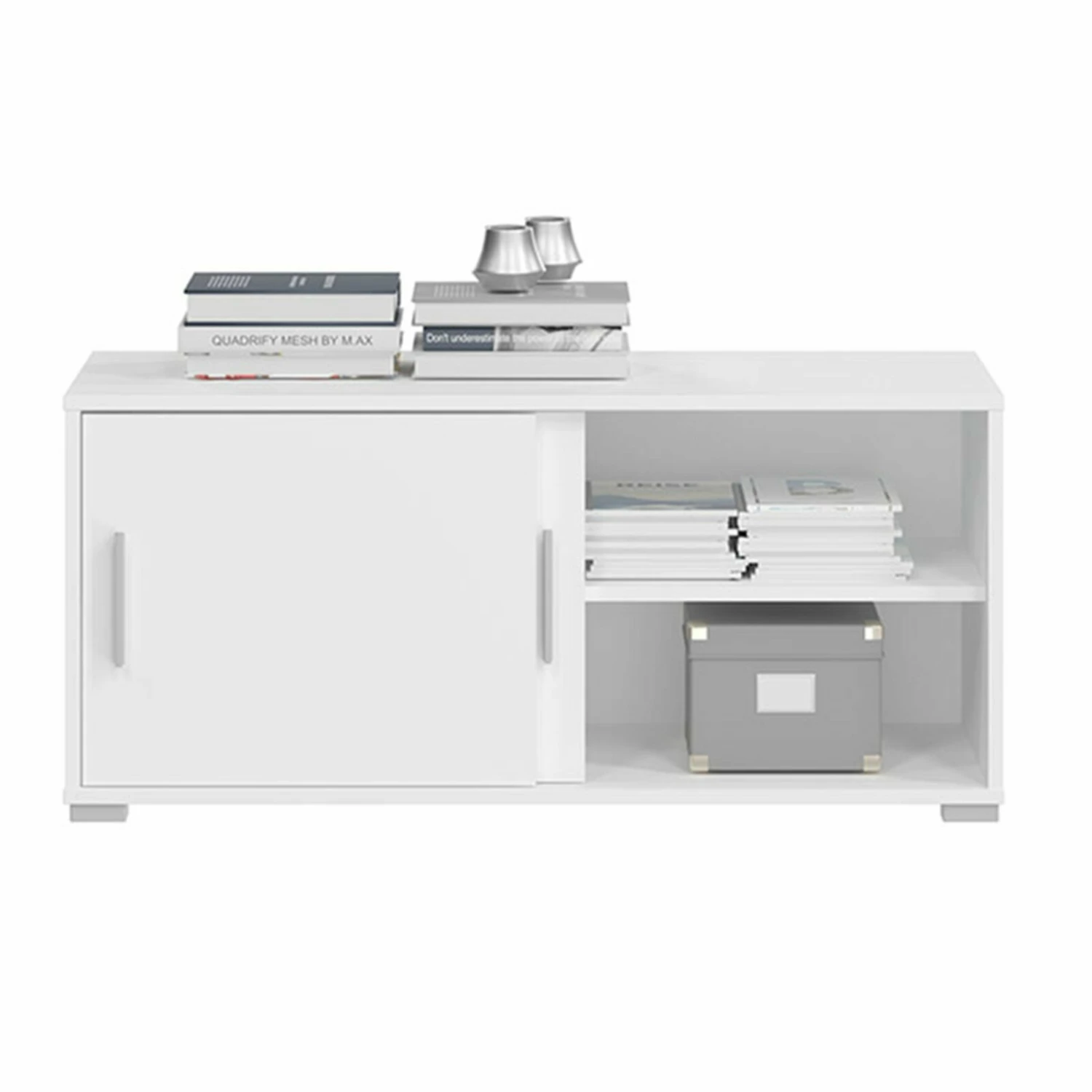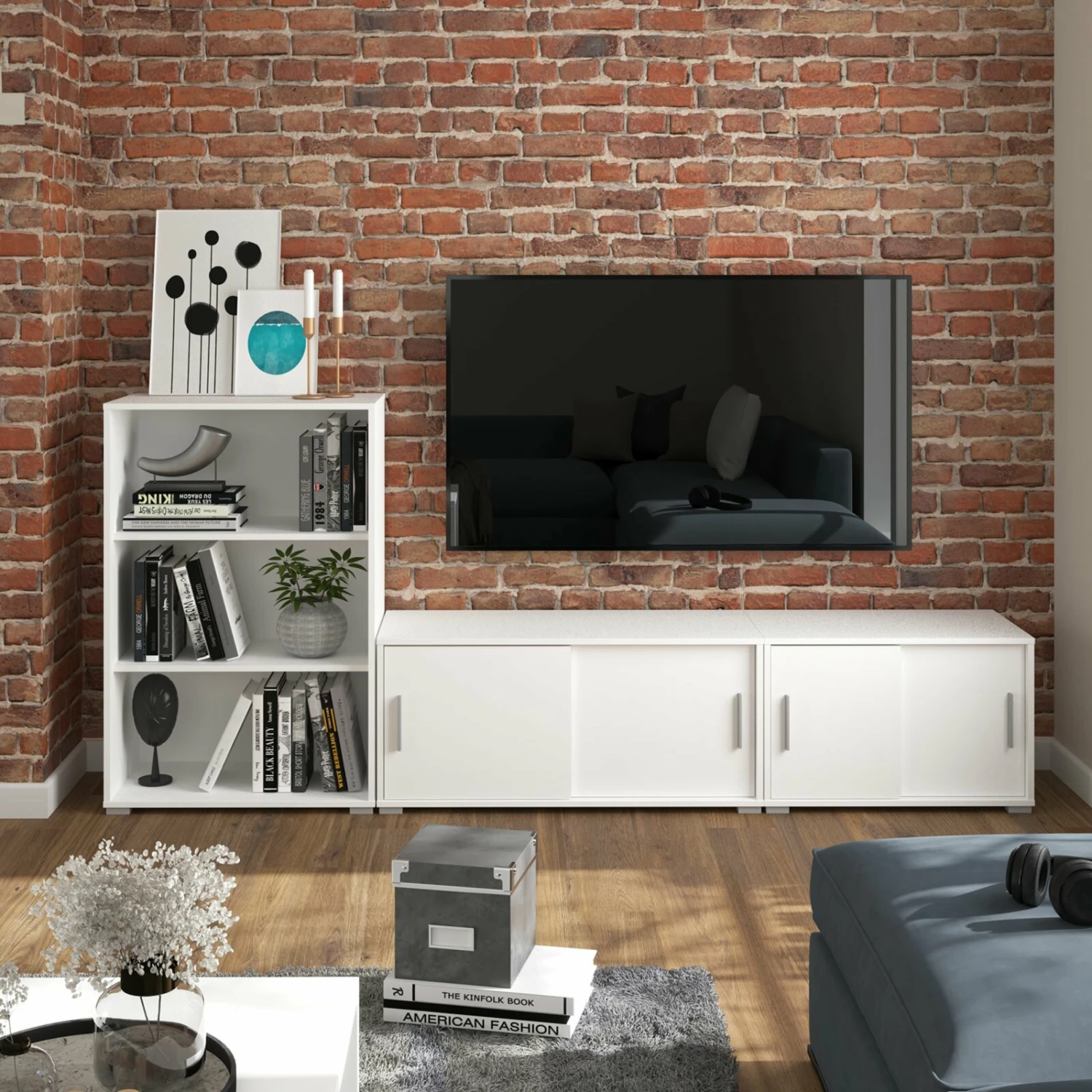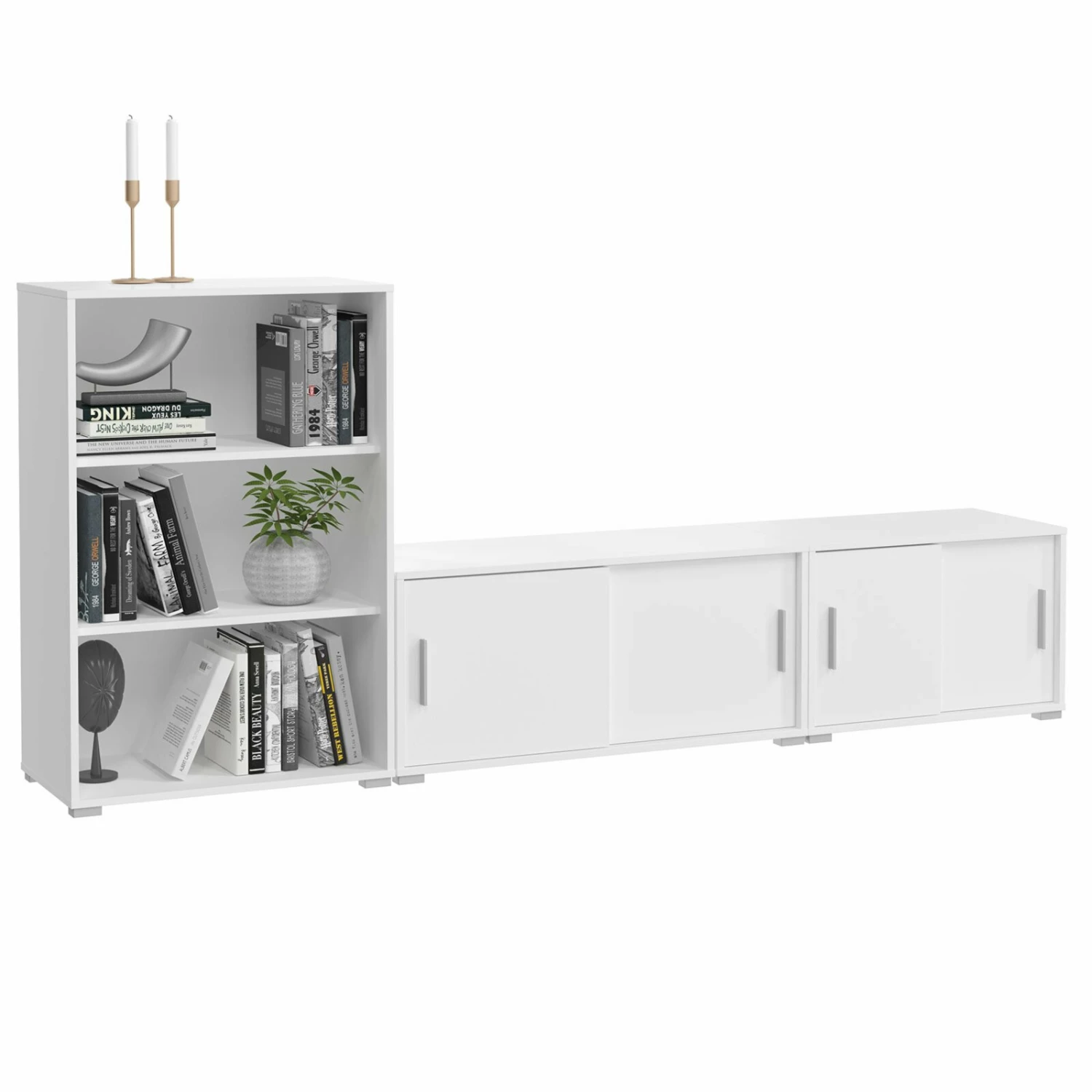 Das dreiteilige Wohnwand-Set überzeugt mit schlichtem Design und eignet sich perfekt für kleinere Wohnzimmer. Das Set setzt sich aus einem offenen Regal und zwei Kommoden mit unterschiedlichen Breiten zusammen. Das offene Regal können Sie bestens für Dekorationszwecke, wie zum Beispiel für Bilderrahmen oder Pflanzen nutzen. In den Kommoden wird Ihnen eine Menge Stauraum für Ihre Gebrauchsgegenstände geboten. Die Schiebetüren mit modernen Kunststoffgriffen in Alu-Optik lassen sich bequem öffnen und schließen. Werten Sie Ihr Wohnzimmer mit diesem Set auf.