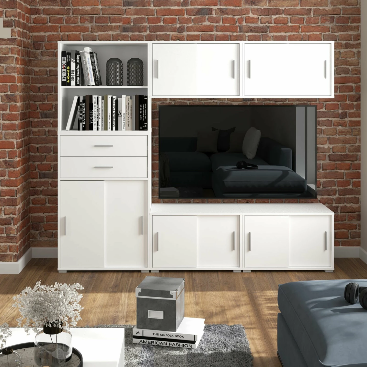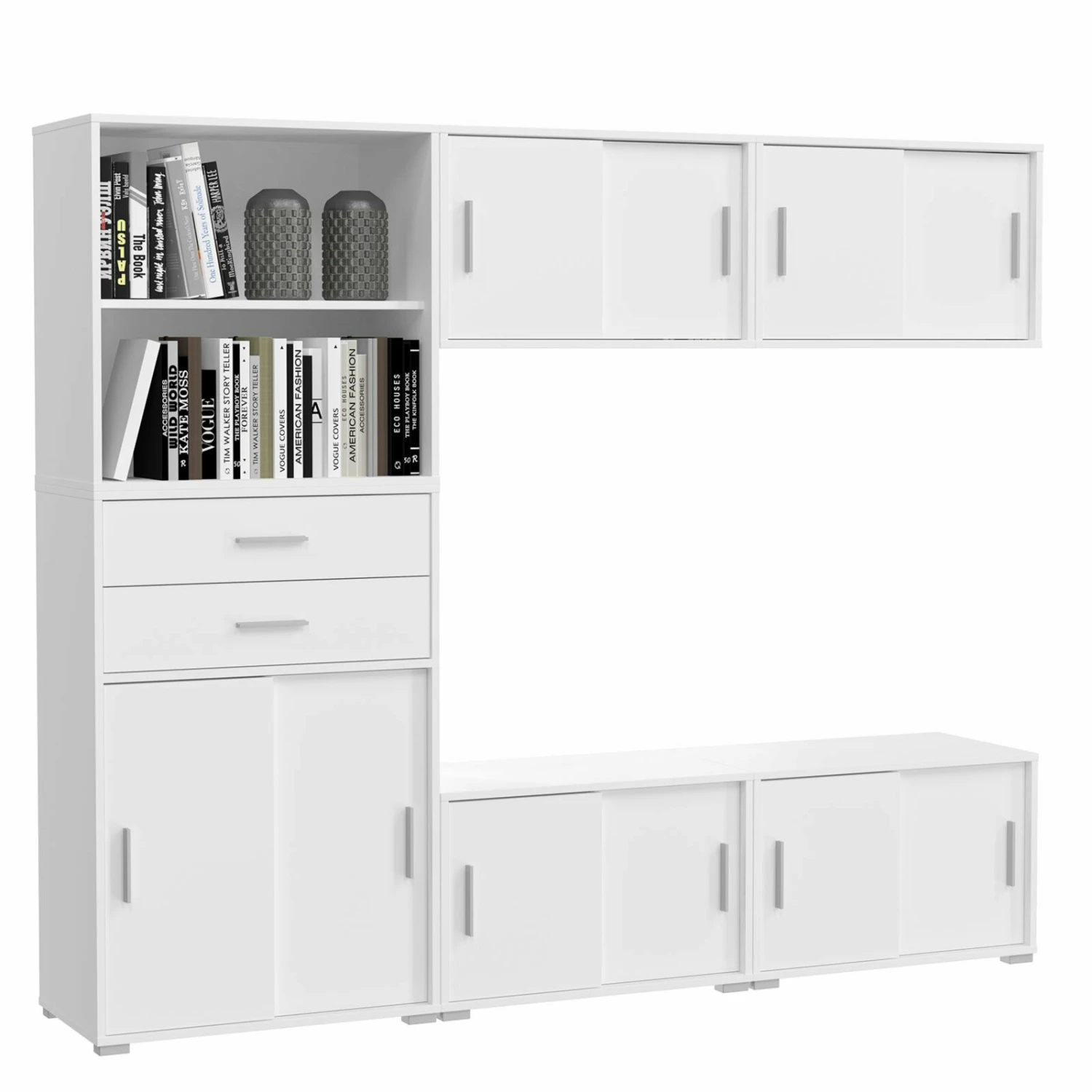 Das sechsteilige Wohnwand-Set punktet mit schlichtem und modernem Design zugleich. Das Set setzt sich aus einem offenen Regal, vier Schiebetürenschränken sowie einer Kommode mit Schiebetüren und Schubkästen zusammen. In den Kommoden wird Ihnen eine Menge Stauraum für Ihre Gebrauchsgegenstände geboten. Die Schiebetüren lassen sich bequem öffnen und schließen. Zudem eignet sich das offene Regal bestens für Dekorationszwecke, wie zum Beispiel Bilderrahmen oder Pflanzen. Werten Sie Ihr Wohnzimmer mit diesem Set auf.