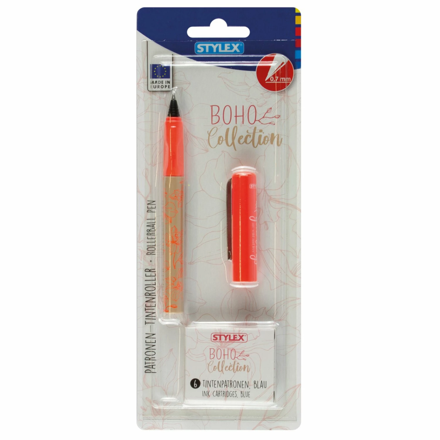 Im trendigen Bohemian-Style überzeugt dieses 7-teilige Tintenroller-Set. Neben dem Tintenroller mit Metallspitze sind im Lieferumfang 6 Tintenpatronen enthalten. Die Verschlusskappe ist zudem mit einem praktischen Clip ausgestattet. Der Tintenroller weist eine Strichstärke von etwa 0,7 mm auf und ist sowohl für Rechts- als auch für Linkshänder geeignet.