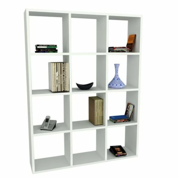 Modernes Bücherregal in Weiß mit 12 Ablagefächern. Hier haben Sie viel Stauraum für unterschiedliche Utensilien. Teilen Sie Ihren Wohnraum, dank der stilvollen Form auch ideal als Raumteiler nutzbar.