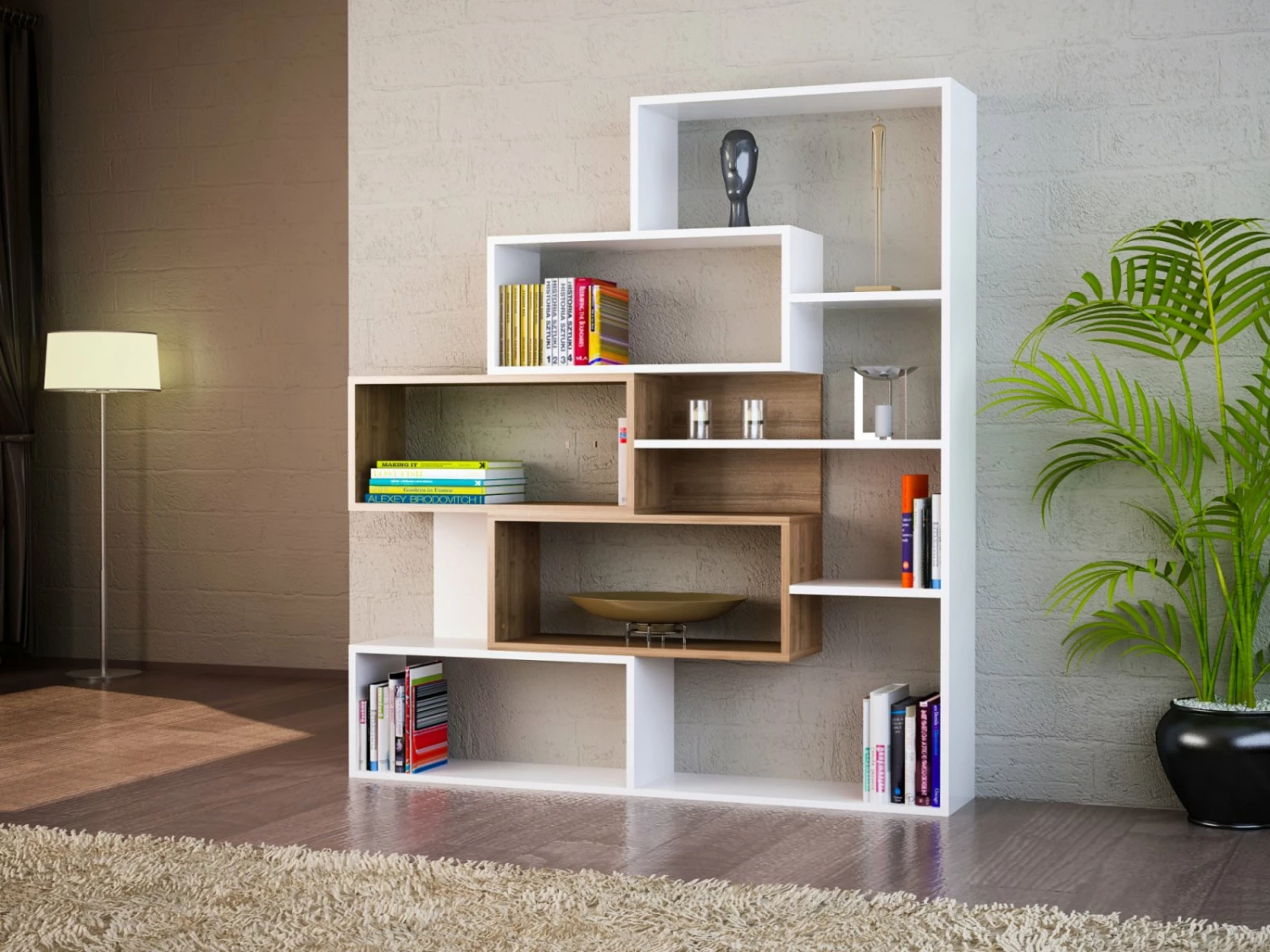 Das ausgefallene und moderne Design dieses Bücherregales in Weiß-Walnuss verleiht Ihren Räumen das gewisse Etwas. Die zahlreichen Ablagefächer bieten reichlich Platz für Ihre Bücher und Utensilien.