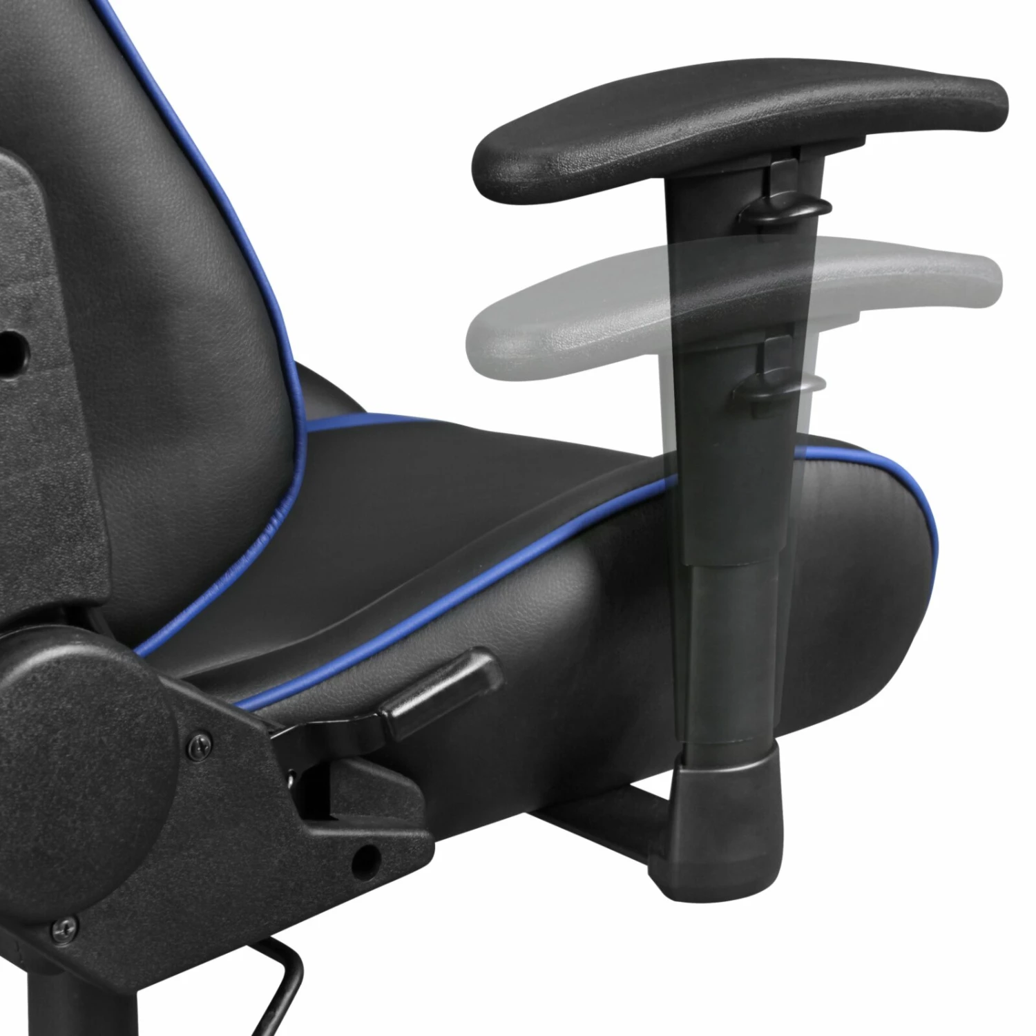 Der Bürostuhl ist ein echter Gaming-Stuhl der mit Komfort punktet. Er lässt sich in der Höhe verstellen und auch die Armlehnen können an Ihrer Körpergröße angepasst werden. Mittels Hebel kann die Neigung der Rückenlehne von 12 bis zu 135 Grad verändert werden. Er ist mit einer besonders hohen Rückenlehne ausgestattet, die die Schultern optimal unterstützt. Ein Lendenwirbelkissen für einen gestützen Rücken ist im Lieferumfang enthalten. Bezogen ist der üppig gepolsterte Stuhl mit einem schicken Kunstleder in Blau und Schwarz.