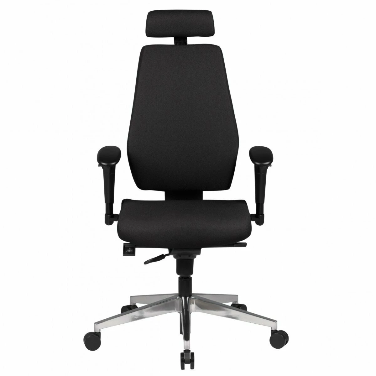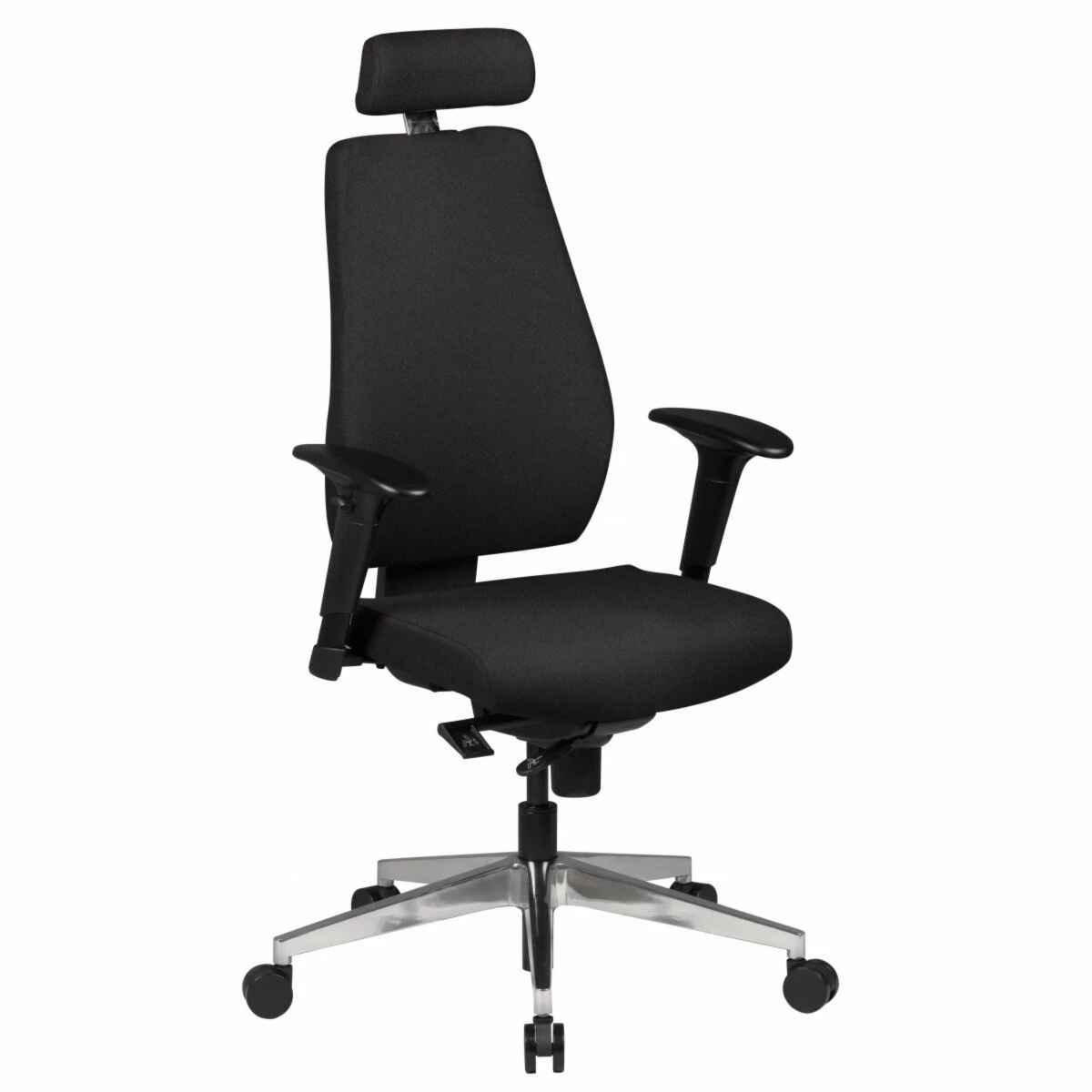 Der schwarze Bürostuhl überzeugt durch eine ergonomisch geformte Rückenlehne, die genau wie der Sitz üppig gepolstert ist. Die 3-Punkt-Synchronmechanik ermöglicht es den Neigungswinkel in 3-Stufen zu arretieren, sowie die Höhe der Rückenlehne und der Kopfstütze individuell anzupassen. Der komplette Sitzbereich kann mittels Gaslift im Bereich von 12 cm verstellt werden. Das Aluminium-Fußkreuz steht im Kontrast zu dem komplett schwarzen Stoffbezug.