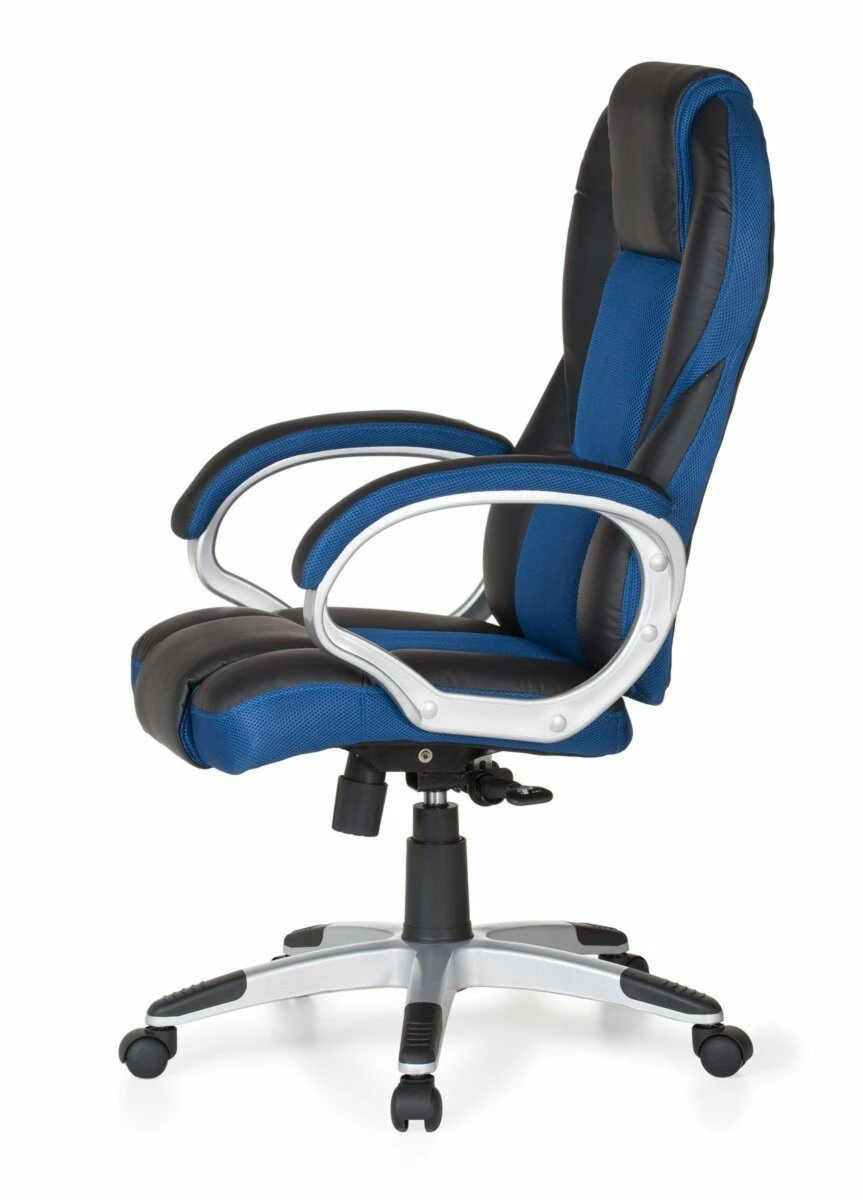 Bei diesem schwarz-blauen Bürostuhl ist von der üppigen Polsterung bis hin zur Höhenverstellung alles dabei! Dieser Komfort ist bei einer achtstündigen Arbeitzeit unbedingt nötig. Die ergonomische Form und die extra breite Rückenlehne mit zusätzlichen Seitenpolstern machen diesen Stuhl zur reinsten Wohlfühloase. Mit dem Gaslift können Sie die Sitzhöhe nach Ihrem Wunsch anpassen. Die empfohlene Sitzdauer liegt bei diesem Bürostuhl bei etwas acht Stunden.