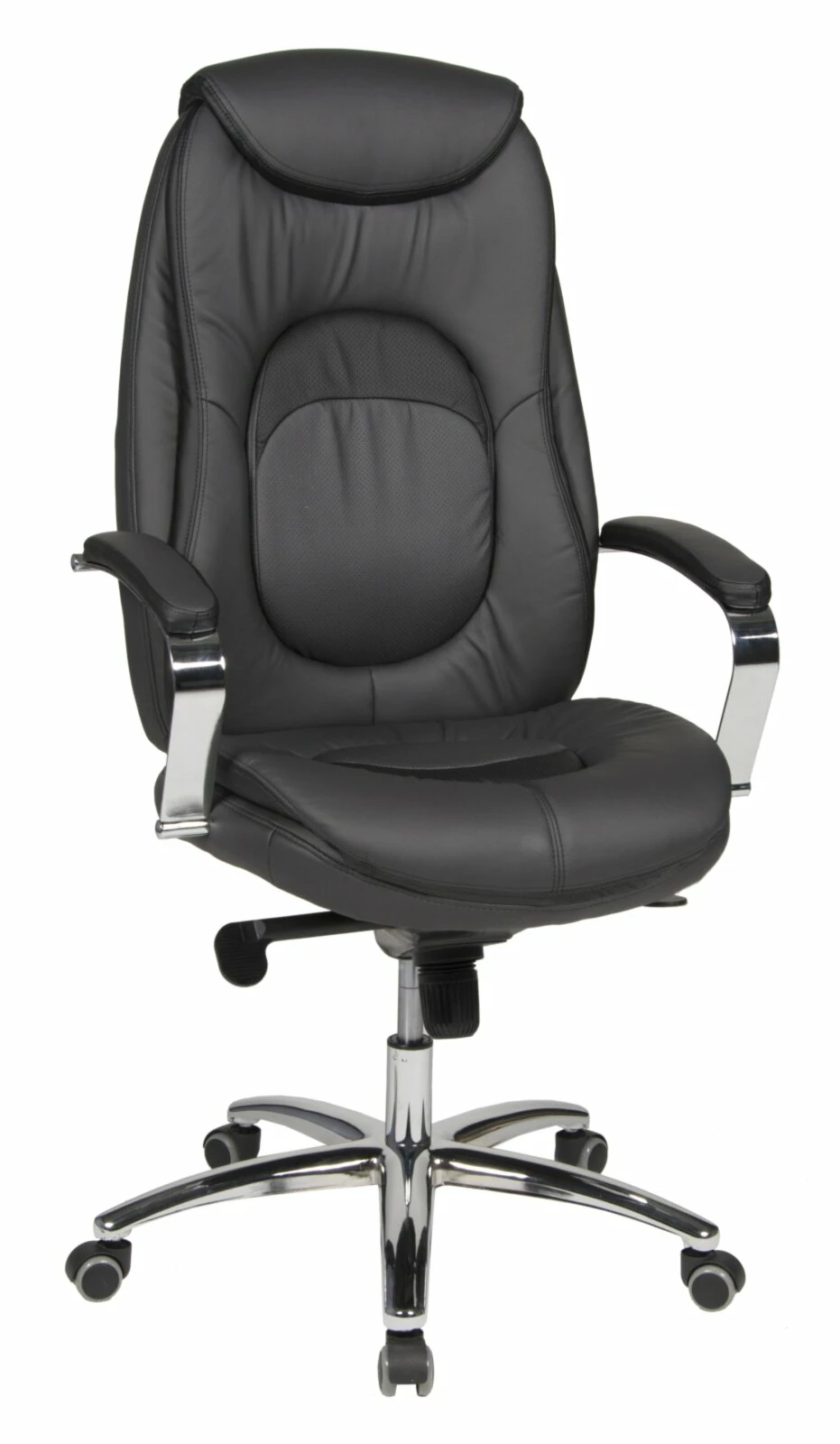 Der Chefsessel ist mit einem ausgewähltem Lederoptik-Bezug in Anthrazit-Schwarz bezogen. Dieser ist mit einer zeitgemäßen Lochapplikation im Sitz und im Rücken kombiniert. Das Fußkreuz aus robustem Metall ist chromfarben. Im Lieferumfang enthalten sind die gembremsten Sicherheitsrollen, die für feste Bodenbeläge geeignet sind. Eine stufenlose Sitzhöhenverstellung durch die geprüfte Sicherheitsgasdruckfeder ist möglich. Der Chefsessel hat eine Soft-Tec Wippfunktion mit Körpergewichteinstellung für ein sanftes Wippverhalten ist gelenkschonend und komfortabel. Die Armlehnen sind zu Ihrem Komfort gepolstert. Bis zu 6 Stunden können Sie hier am Tag gemütlich sitzen und Ihrer Arbeit nachgehen. Belastet werdem kann der Stuhl mit etwa 150 kg.
