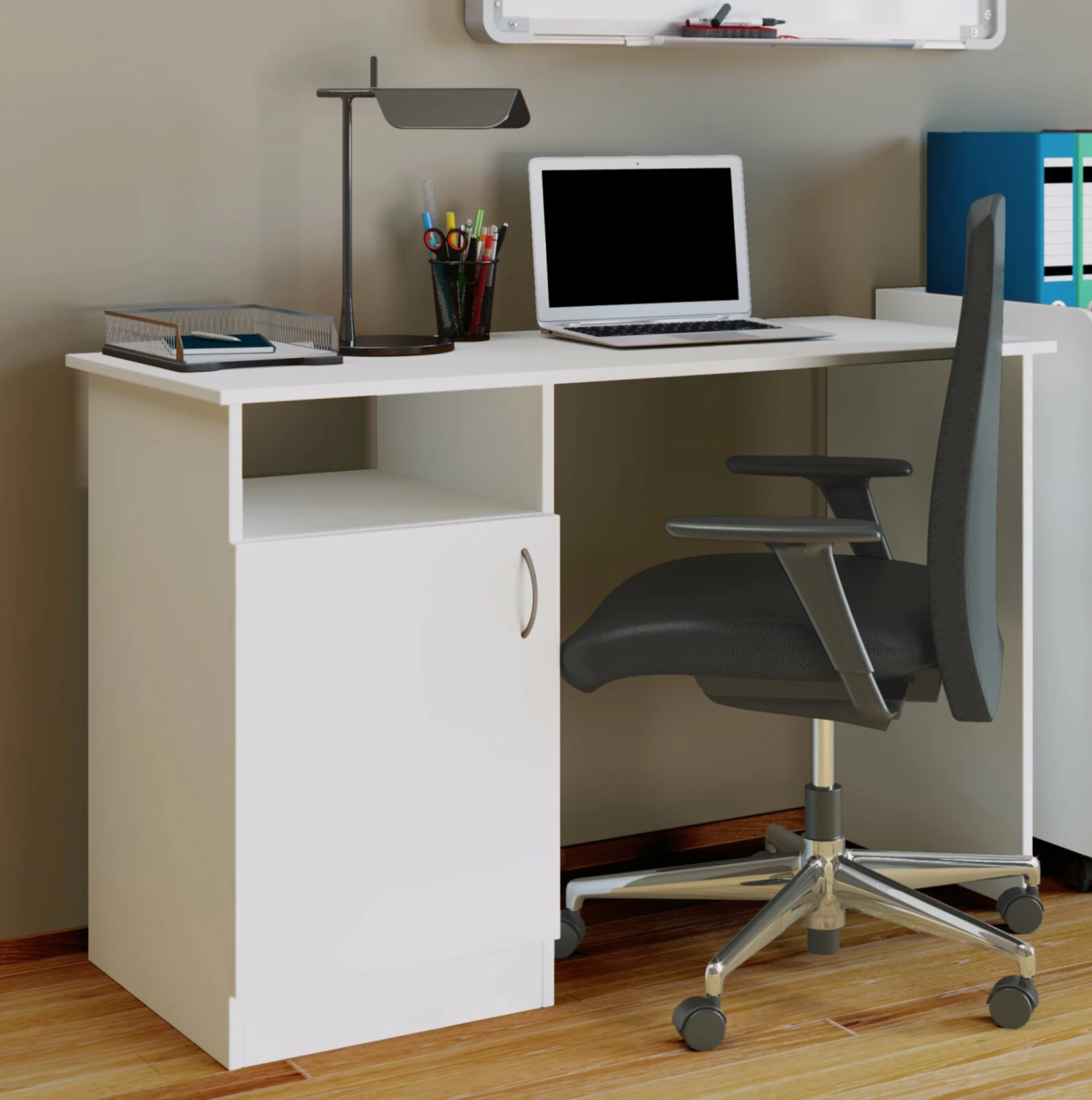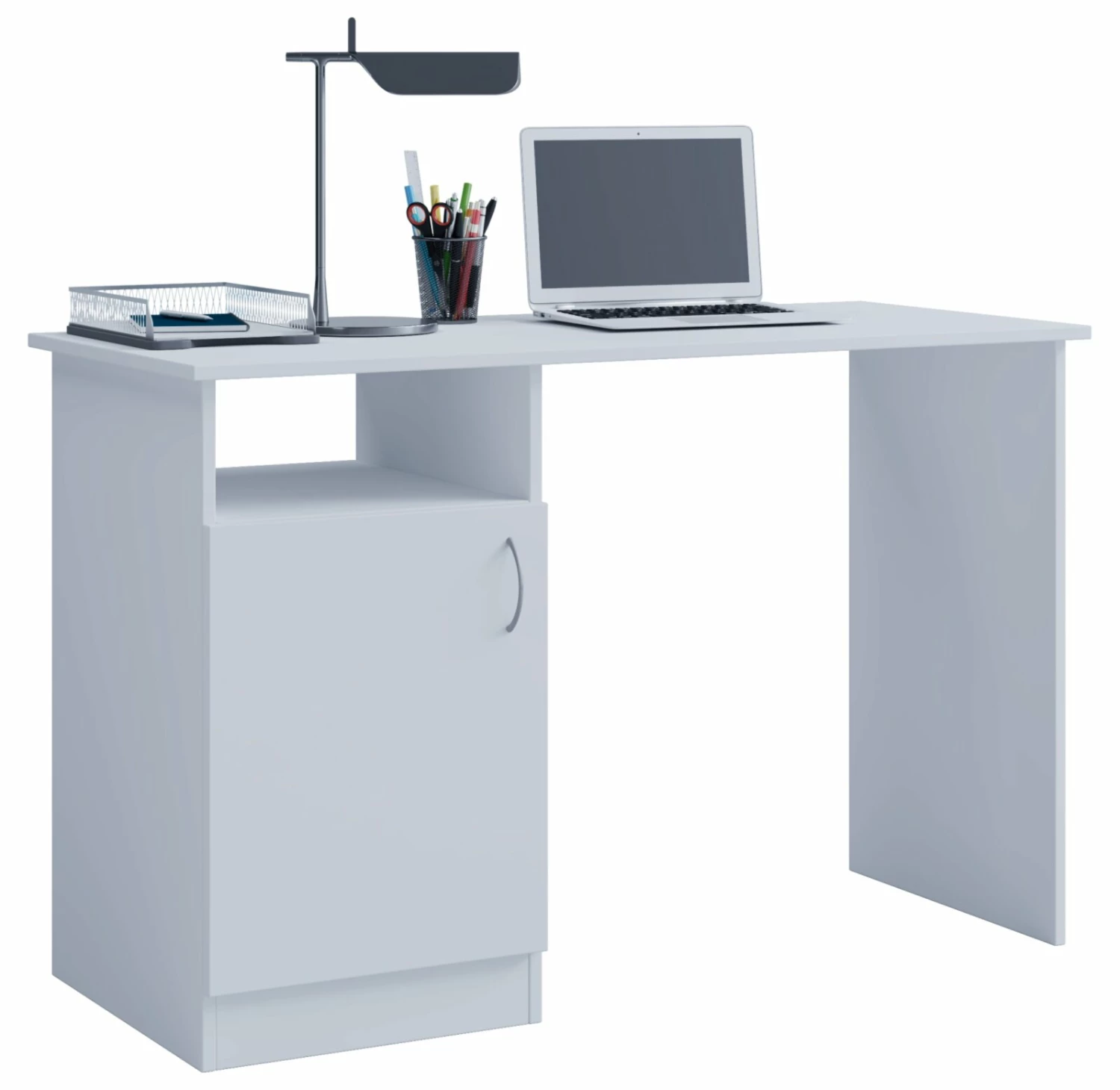 Kompakter Schreibtisch, der genug Arbeitsfläche und Stauraum bietet. Er ist für das Büro genauso geeignet, wie für das Kinderzimmer oder den Hobbyraum. Nutzen Sie die Fläche für eine Lampe und alles, was Sie schnell zur Hand haben möchten. Ablagemöglichkeiten bieten sich in einem offenen Fach. Darunter können Sie ihre Unterlagen hinter einer Drehtür aufbewahren.