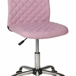 Der Drehstuhl mit rosafarbenem Bezug mit Rautensteppung ist ein wahrer Blickfang. Stabil ist der Stuhl durch sein Gestell aus Metall. Er ist höhenverstellbar und die empfohlene Sitzdauer liegt bei etwa 6 Stunden. Die maximale Belastbarkeit leigt bei 70 kg. Die Lieferung erfolgt mit Teppichbodenrollen.