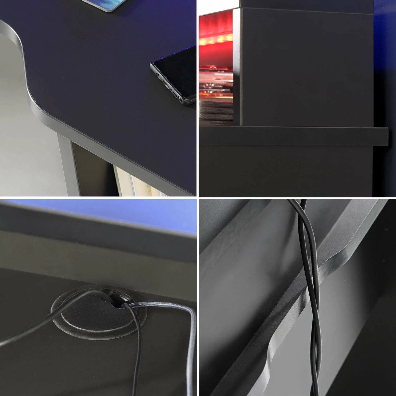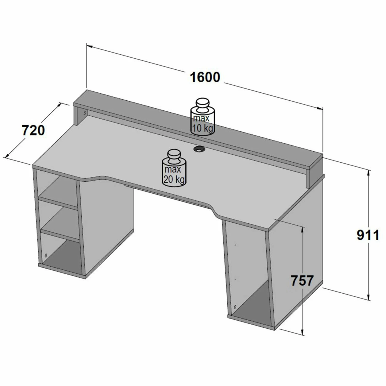 Für echte Gamer ist dieser Schreibtisch ein absolutes Muss! Der Tisch bietet nicht nur ein großzügiges Fach für Ihren Computer Tower, sondern auch Platz für mehrere Monitore. Hierfür steht Ihnen eine zusätzliche Ablage zur Verfügung, die eine Breite von etwa 160 Zentimeter hat. Sehr praktisch ist zudem die vorhandene Kabeldurchführung, sodass die vielen notwendigen Kabel auch ordentlich untergebracht werden können. Die beiden Einlegeböden können Sie variabel links oder rechts montieren, je nachdem, wo Sie Ihren Computer platziert haben wollen. Auf der großen Arbeitsfläche bietet der Gamer-Schreibtisch reichlich Platz für Ihre Maus, Tastatur und Ihr zusätzliches Zubehör.