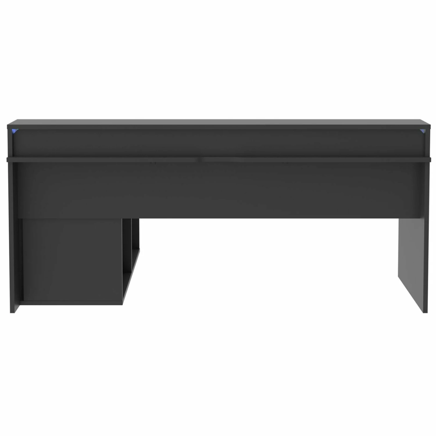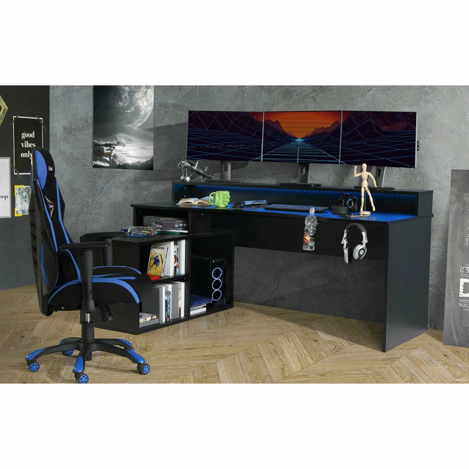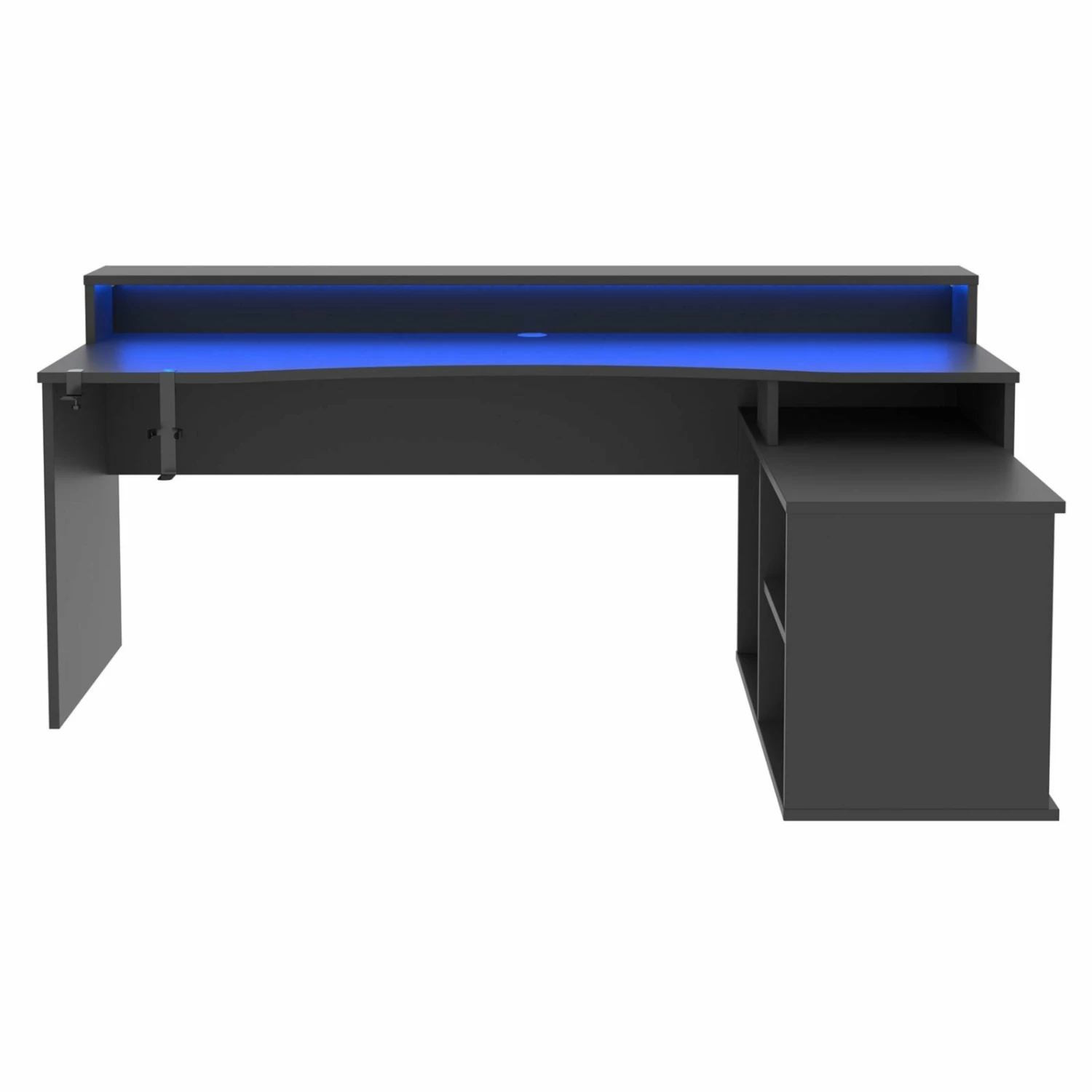 Dieser schicke Schreibtisch in mattem Schwarz lässt Gamer-Herzen höher schlagen! Bei diesem Gamer-Schreibtisch trifft trendiges Design auf Funktionalität. Auf zwei Ebenen können Sie ihr Gamingzubehör ausbreiten. Die höhere Ebene bietet sich hervorragend an, um mehrere Monitore zu platzieren. So behalten Sie stets den Überblick. Auf der unteren Ebene finden zum Beispiel Ihre Tastatur, Maus und Mousepad ihren Platz. Zudem befindet sich hier ein Kabeldurchlass, damit Kabelsalat den Spielspaß oder Ihre Arbeit nicht beeinträchtigt. Zusätzlich umfasst der Tisch eine LED-Beleuchtung mit integriertem Farbwechsel, einen Getränke- sowie einen Kopfhörerhalter. So macht Zocken richtig Spaß!