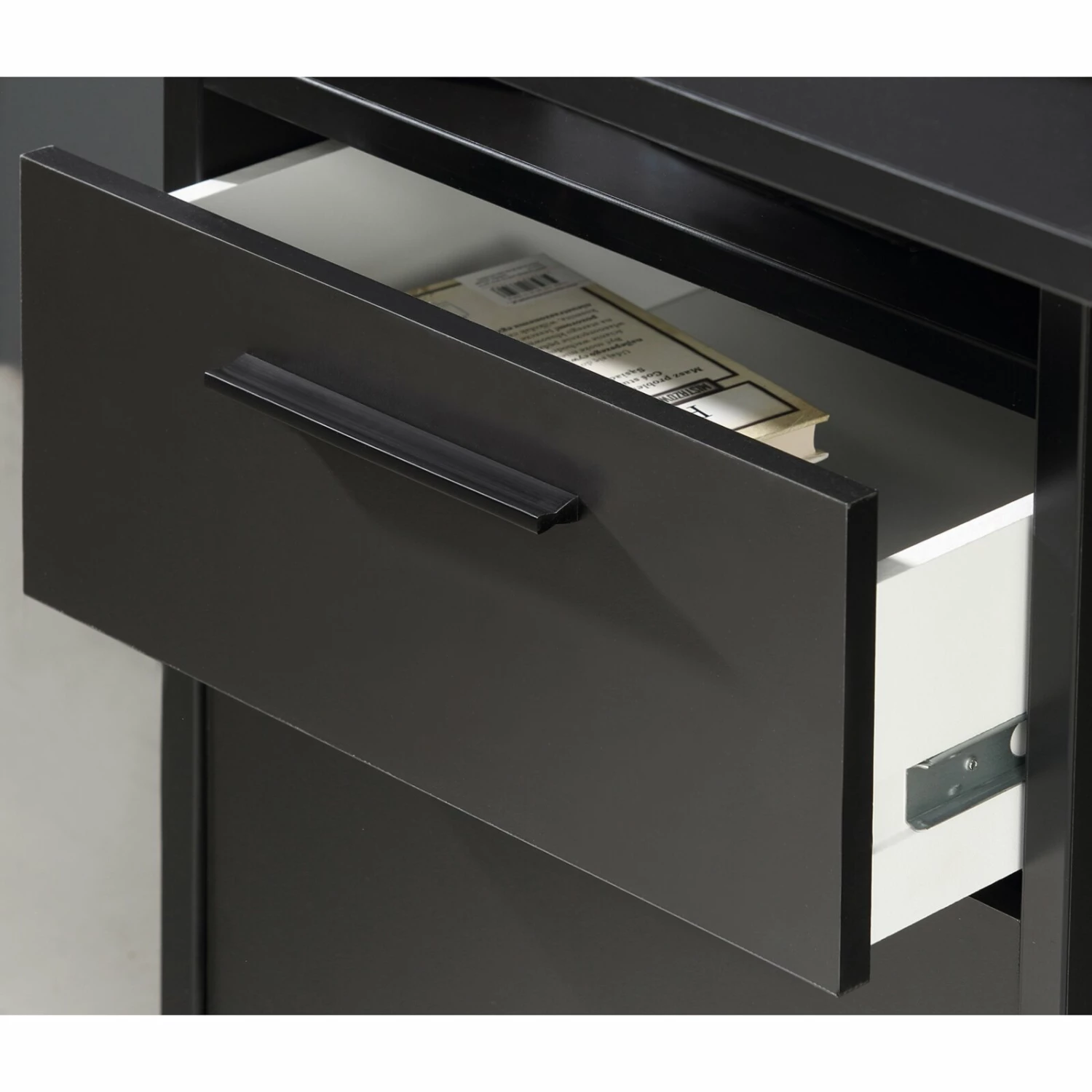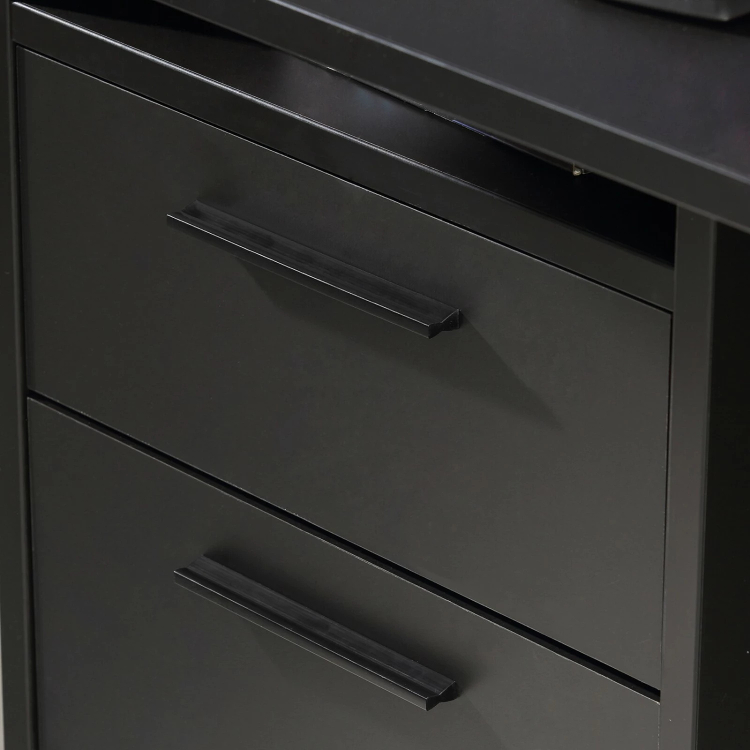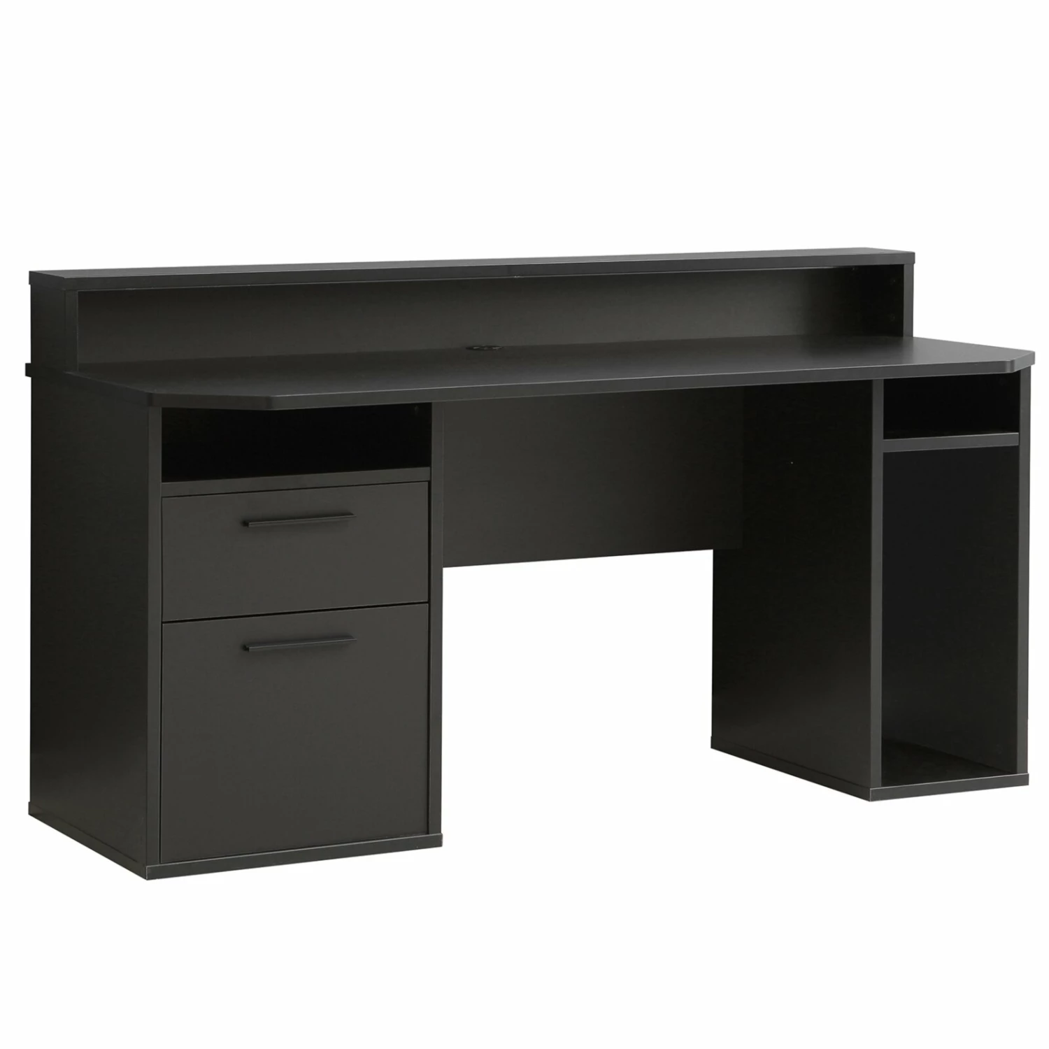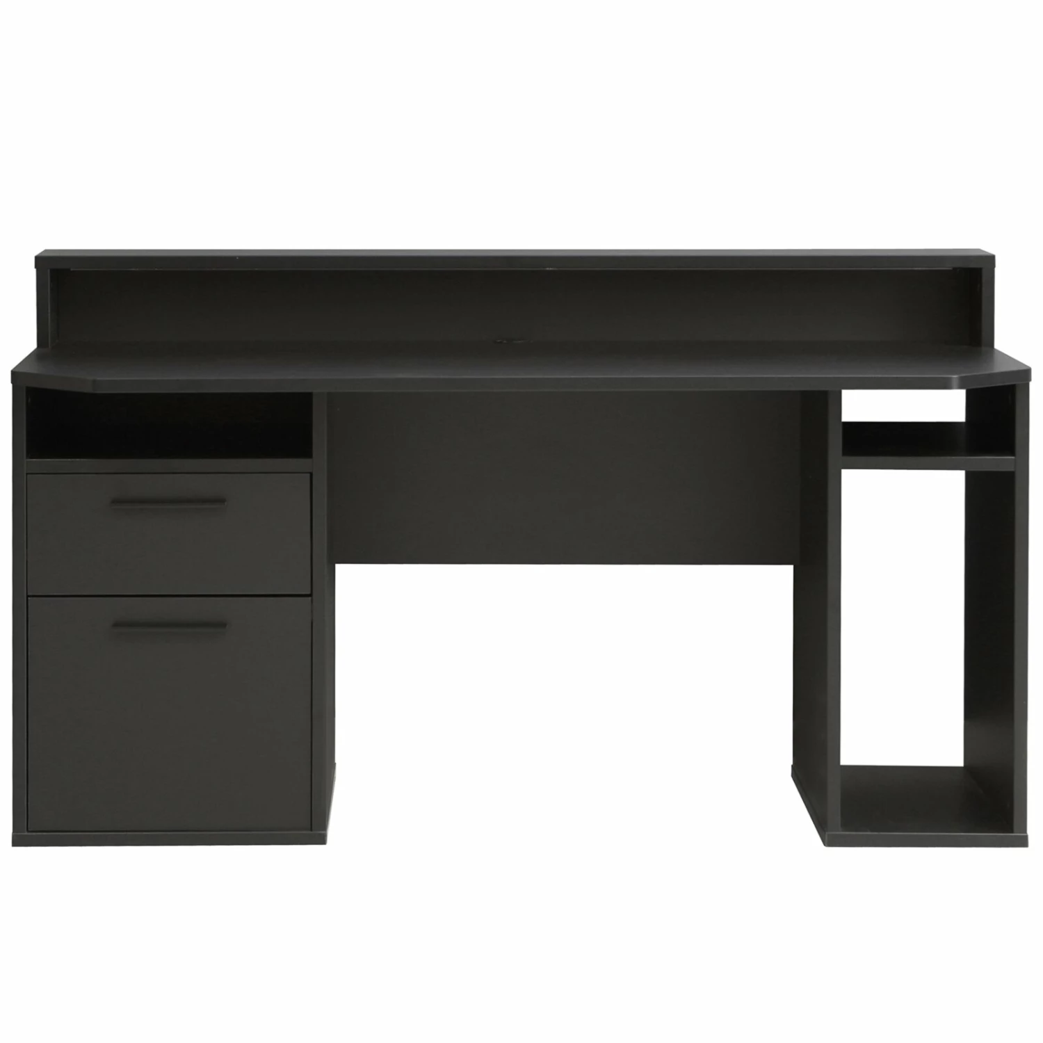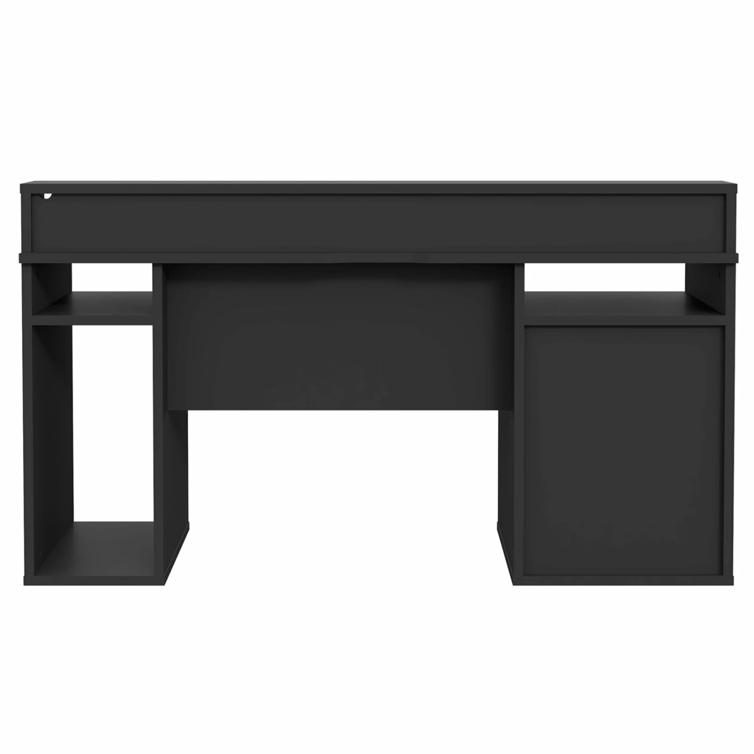 Dieser coole Gamer-Schreibtisch in einem matten Schwarz überzeugt vor allem durch sein cooles Design. Zudem ist die Schreibttischplatte praktischerweise abgeschrägt an den Seiten und das offene Fach eignet sich idealerweise für einen Tower-PC. Mit dem Schubkasten und der darunter befindlichen Tür mit einem großen Fach haben Sie ausreichend Stauraum für Controller oder Schreibutensilien. Die Schreibtischplatte ist außerdem optimal auf die Ansprüche von Zockern abgestimmt, da die Platte über einen stabilen Aufatz verfügt, auf dem große Monitore ihren Platz finden. Der sinnvolle Kabeldurchlass sorgt dafür, dass Kabel nicht wild durch die Gegend wandern.