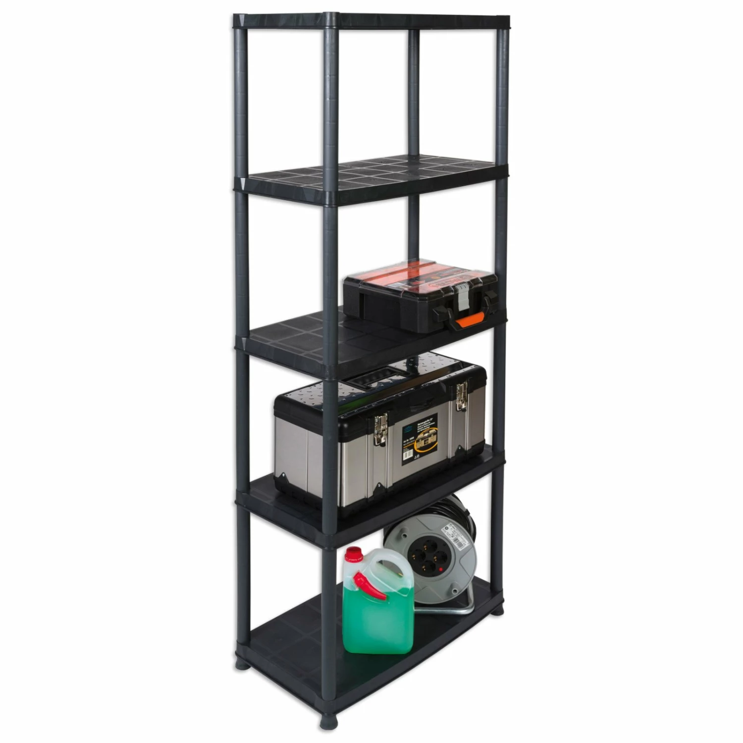 Praktisches Regal, was Ihnen in der Wohnung, im Keller oder im Garten gute Dienste leisten wird. Die fünf Böden sind mit jeweils ca. 30 kg belastbar. Das dezente Schwarz fügt sich in jede Einrichtung mühelos ein.