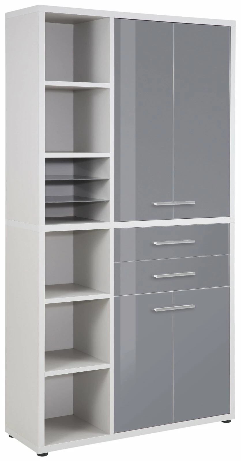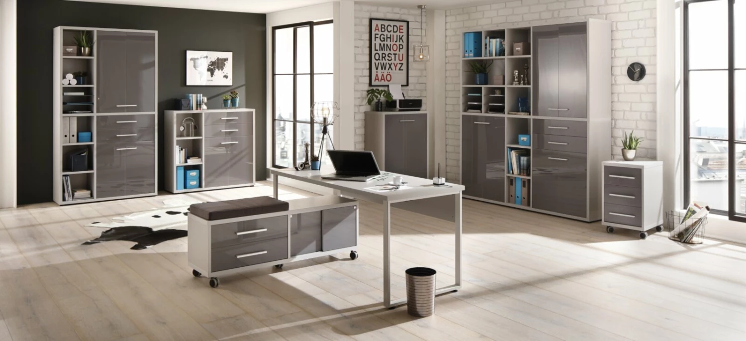Büroschrank-Kombination SET+ in Plantingrau mit Glaseinlegeböden bei den Ablagefächern und viel Stauraum. Hinter den oberen Türen befinden sich zwei höhenverstellbare Einlegeböden und hinter den unteren Türen verfügt der Schrank über einen höhenverstellbaren Einlegeboden. Die Schubkästen mittig bieten zusätzichen Stauraum. Mit diesem Möbelstück halten Sie garantiert Ordnung in Ihrem Arbeitszimmer oder Büro. Melaminharzbeschichtung beugt Kratzern auf der Oberfläche vor.