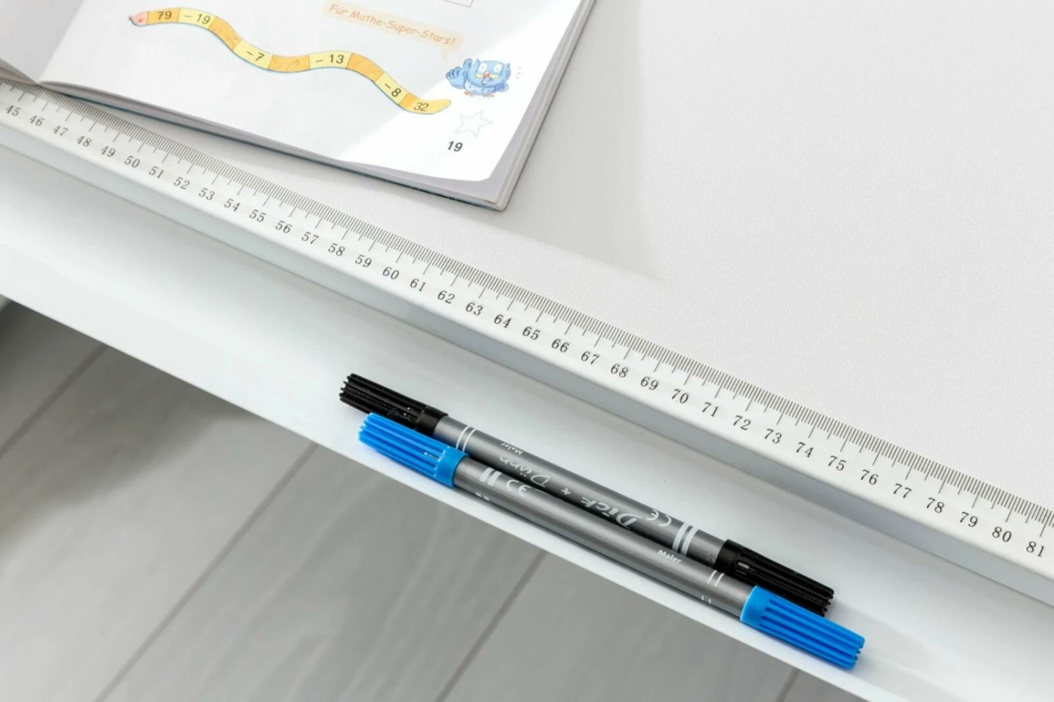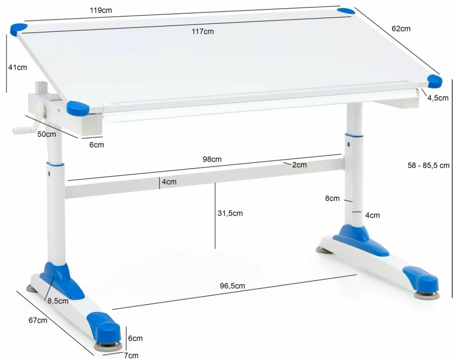 Dieser weiß-blaue Kinderschreibtisch ist ein echtes Allround-Talent! Er lässt sich auf beiden Seiten mittels einer Kurbel stufenlos in der Höhe verstellen und kann somit perfekt angepasst werden. Auch der Neigungswinkel kann in zehn Stufen bis 40° verstellt werden, sodass die optimalen Arbeitsbedingungen für die anfallenden Hausaufgaben geschafft werden können. Die absoluten Highlights sind das integrierte Lineal an der Tischplatte und die Stiftablage. Da die Sicherheit Ihres Kindes vorgeht, sind die Ecken zum Schutz vor Verletzungen mit Kunststoffkappen ausgestattet. Die äußerst robuste Oberfläche ist nicht nur beständig gegen Sonnenlicht und chemische Einflüsse wie Reinigungsmittel, sondern ist zusätzlich auch wasser- und fettabweisend.