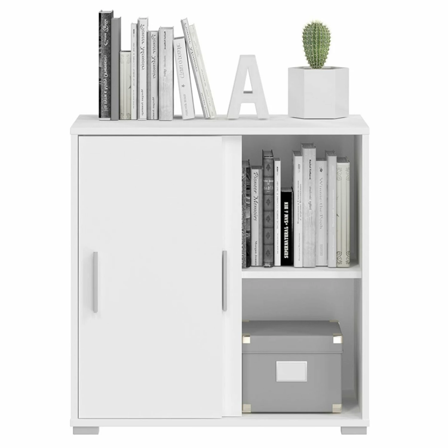Diese weiße Kommode bietet Ihnen viel Stauraum und punktet mit modernem Design. Hinter den beiden Schiebetüren befinden sich, getrennt durch einen Einlegeboden, zwei großzügige Fächer. Die Schiebetüren lassen sich bequem Öffnen und Schließen – auch bei engeren Platzverhältnissen. Die Griffe aus Kunsttoff in Aluoptik runden das moderne Design ab.