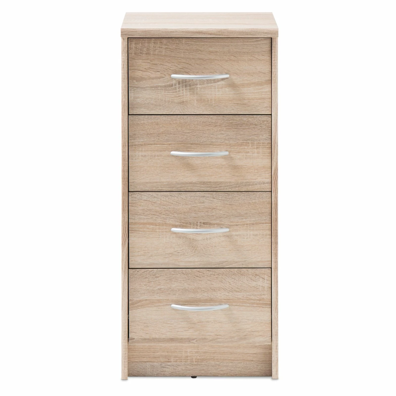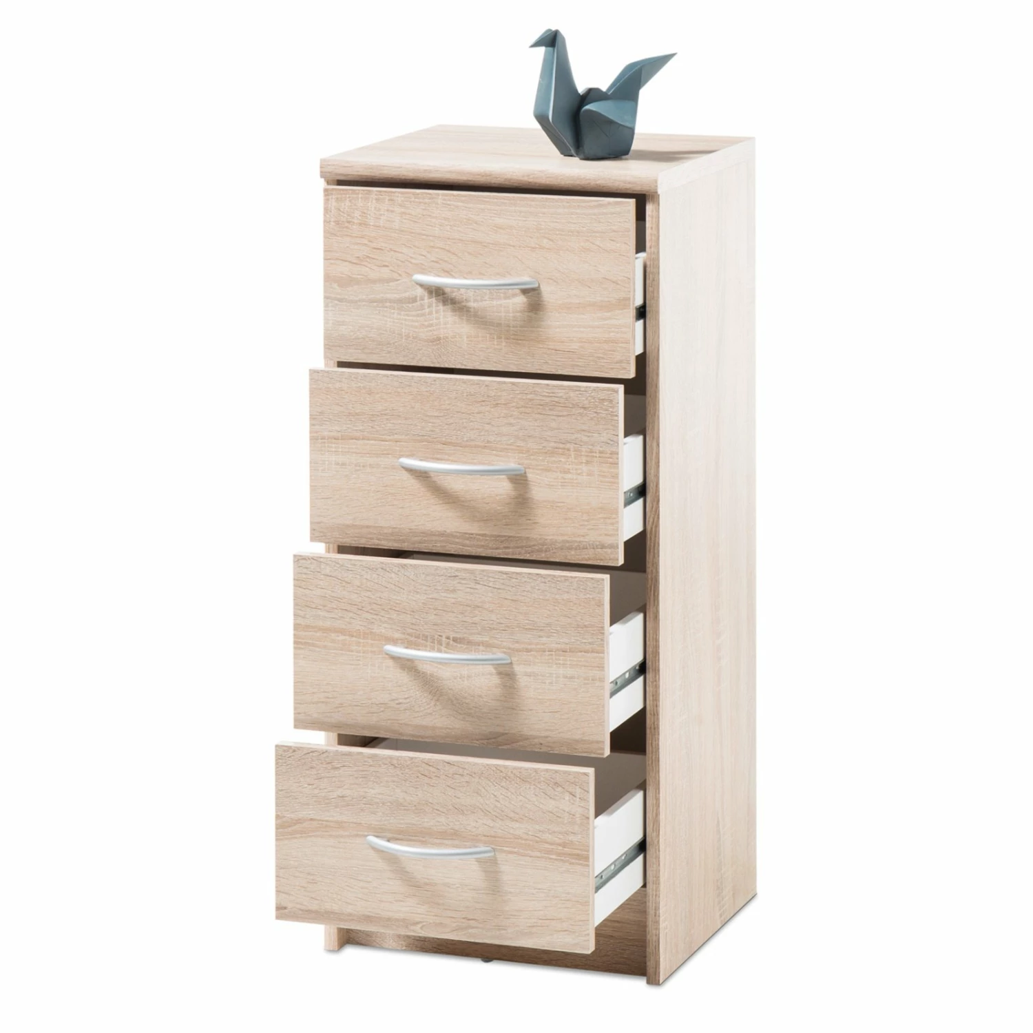 Die Kommode in schicker Sonoma Eichen-Optik bietet mit vier Schubkästen eine Menge Stauraum. Die Ablagefläche eignet sich zum Beispiel sehr gut für Dekorationszwecke.