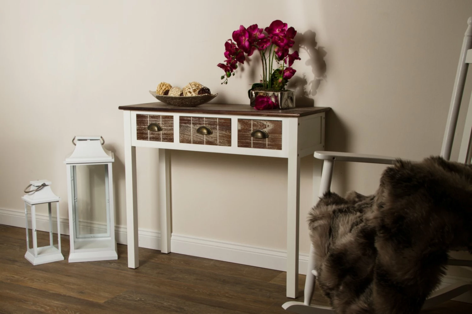 Schöner Konsolentisch, welcher vielseitig eingesetzt werden kann. Als Schmink- und Frisiertisch oder auch in der Diele als Ablage. In drei Schubladen können allerlei Utensilien verstaut werden. Eine schöne Kombination aus Weiß und Braun macht einen absoluten Blickfang aus diesem tollen Tisch.