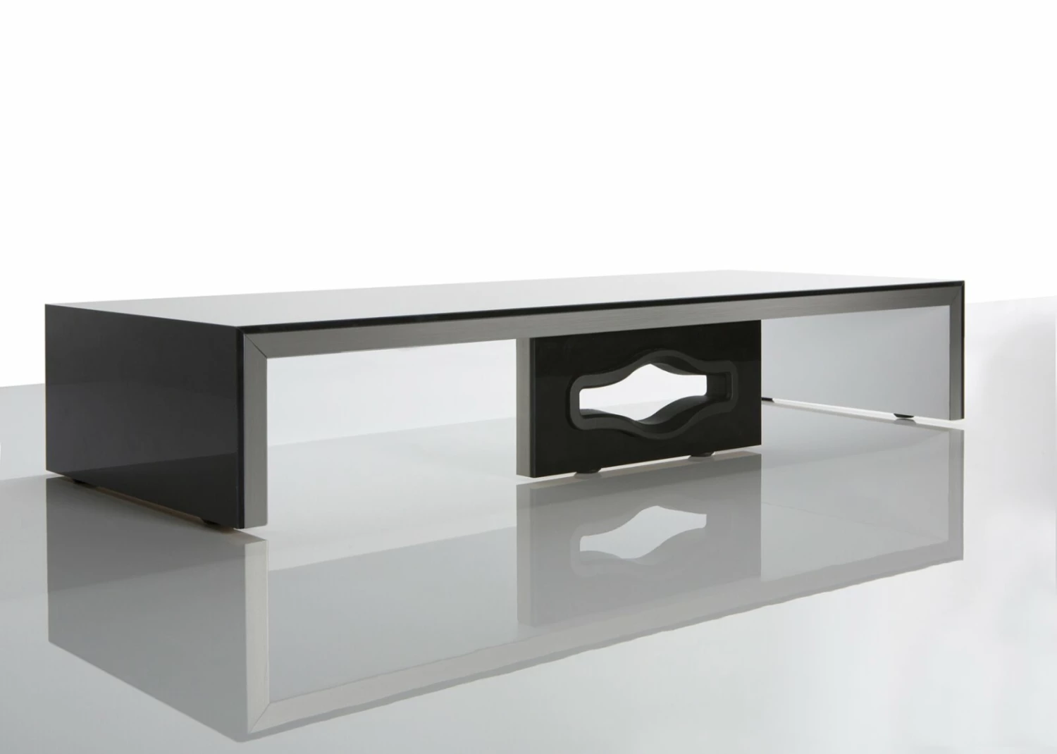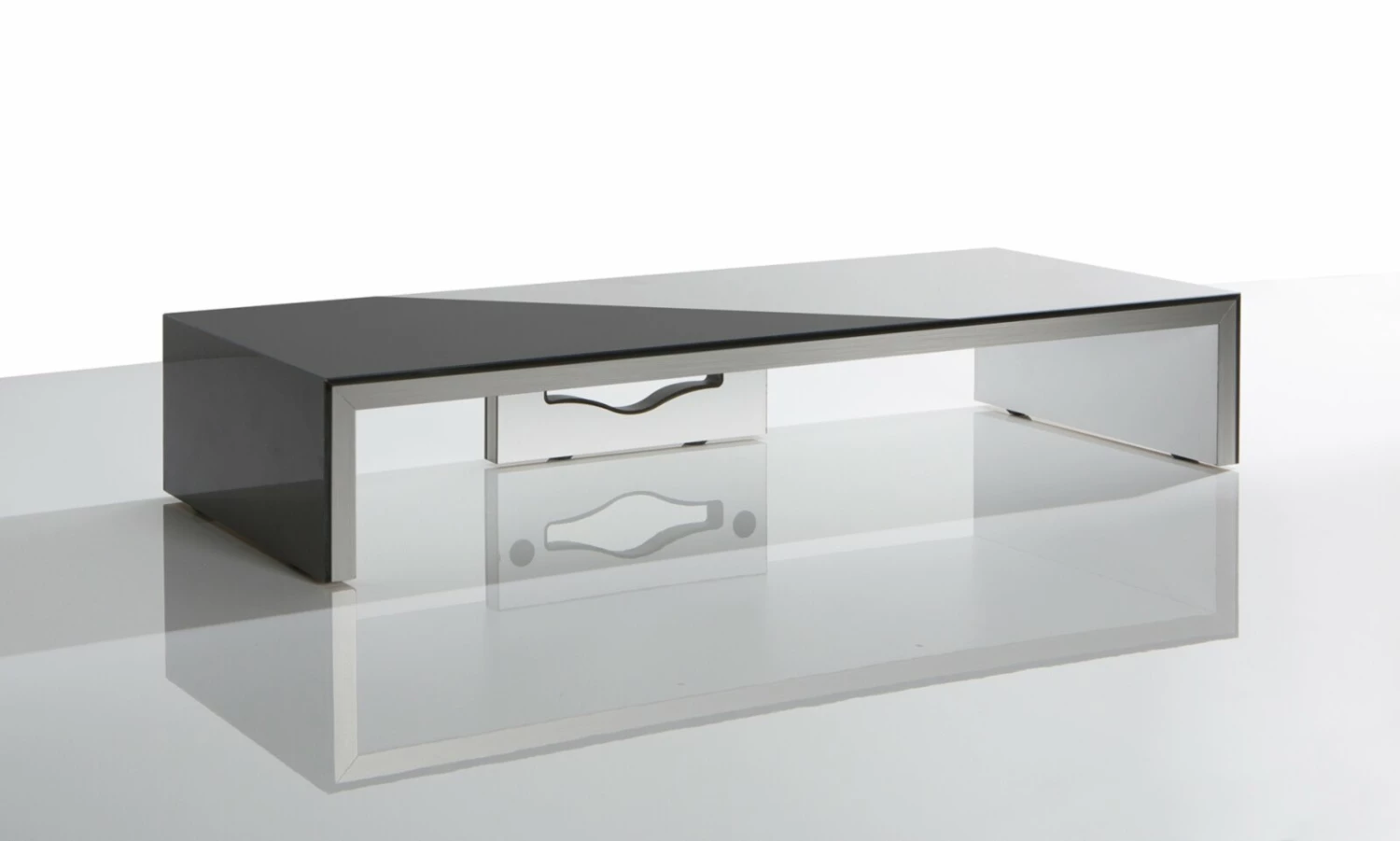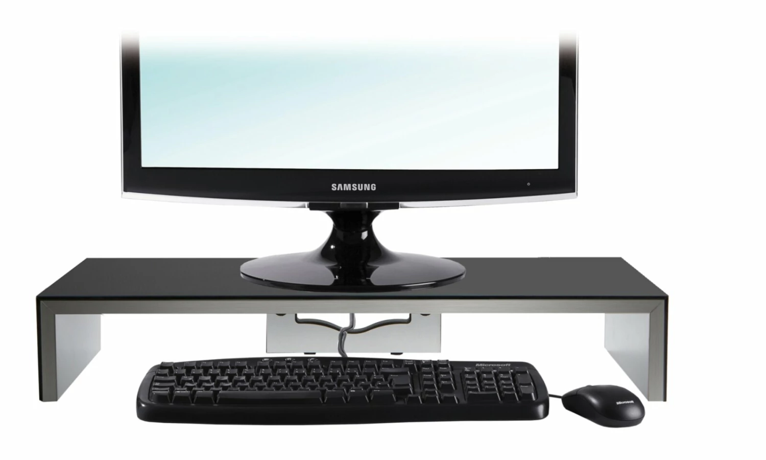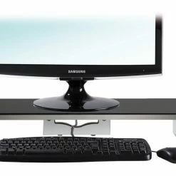 Monitorständer EDLOSA im edlen Design. Die Ecken sind im V-Schnitt gehalten und die schmalen Fronten bestehen aus Polyvinylchlorid in Aluminiumfarben. Zu tiefe und zurückgeneigte Bildschirme strapazieren die Augen, den Nacken und den Rücken, was durch eine erhöhte Platzierung des Monitorständers vermieden werden kann. Ein weiterer Vorteil ist, dass Tastatur, Maus und weitere Büromaterialien platzsparend unter dem Ständer integriert werden können, was zusätzliche Arbeitsfläche schafft.