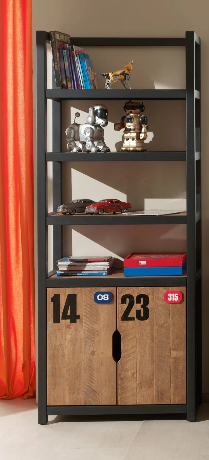 Cooles Regal ALEX mit massiven Bestandteilen aus Kiefer. Die Oberfläche ist gehobelt, gebürstet und gebeizt. Hinter den Türen ist kein Einlegeboden. Darüber befinden sich vier gräumige Regalfächer. Die Böden sind nicht verstellbar.