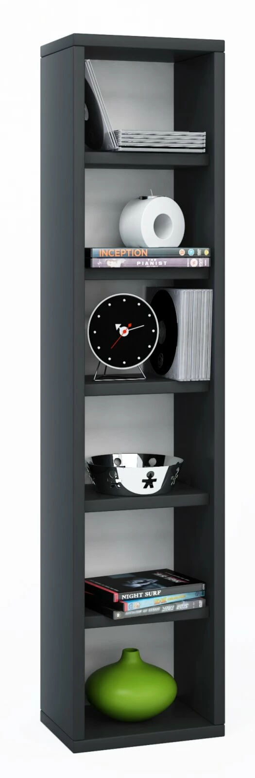 Das Regal „Elementa“ in Schwarz bietet Ihnen Platz für 102 CDs oder 36 DVDs. Eine beliebige Erweiterung kann jederzeit vorgenommen werden, da die Säulen an der Rückseite miteinander befestitgt werden können. In der Höhe misst das Regal ca. 91,5 cm.