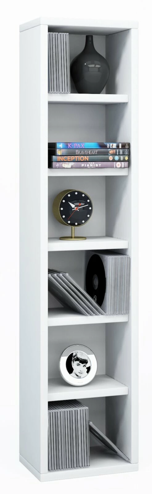 Das Regal „Elementa“ in Weiß mit Holzstruktur-Nachbildung bietet Ihnen Platz für 102 CDs oder 36 DVDs. Eine beliebige Erweiterung kann jederzeit vorgenommen werden, da die Säulen an der Rückseite miteinander befestitgt werden können. In der Höhe misst das Regal ca. 91,5 cm.