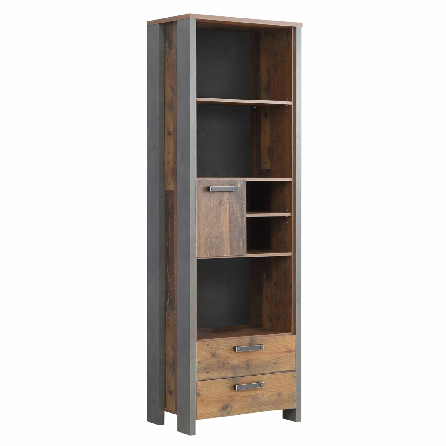 Stylisches Regal im Industrial-Design! Die Old Wood Vintage Nachbildung wird durch die Betonoptik optimal abgerundet. In zwei Schubkästen und hinter einer Tür haben Sie die Möglichkeit Utensilien zu verstauen. In fünf offenen Fächern können Sie beispielsweise Bücher oder Dekoobjekte unterbringen.
