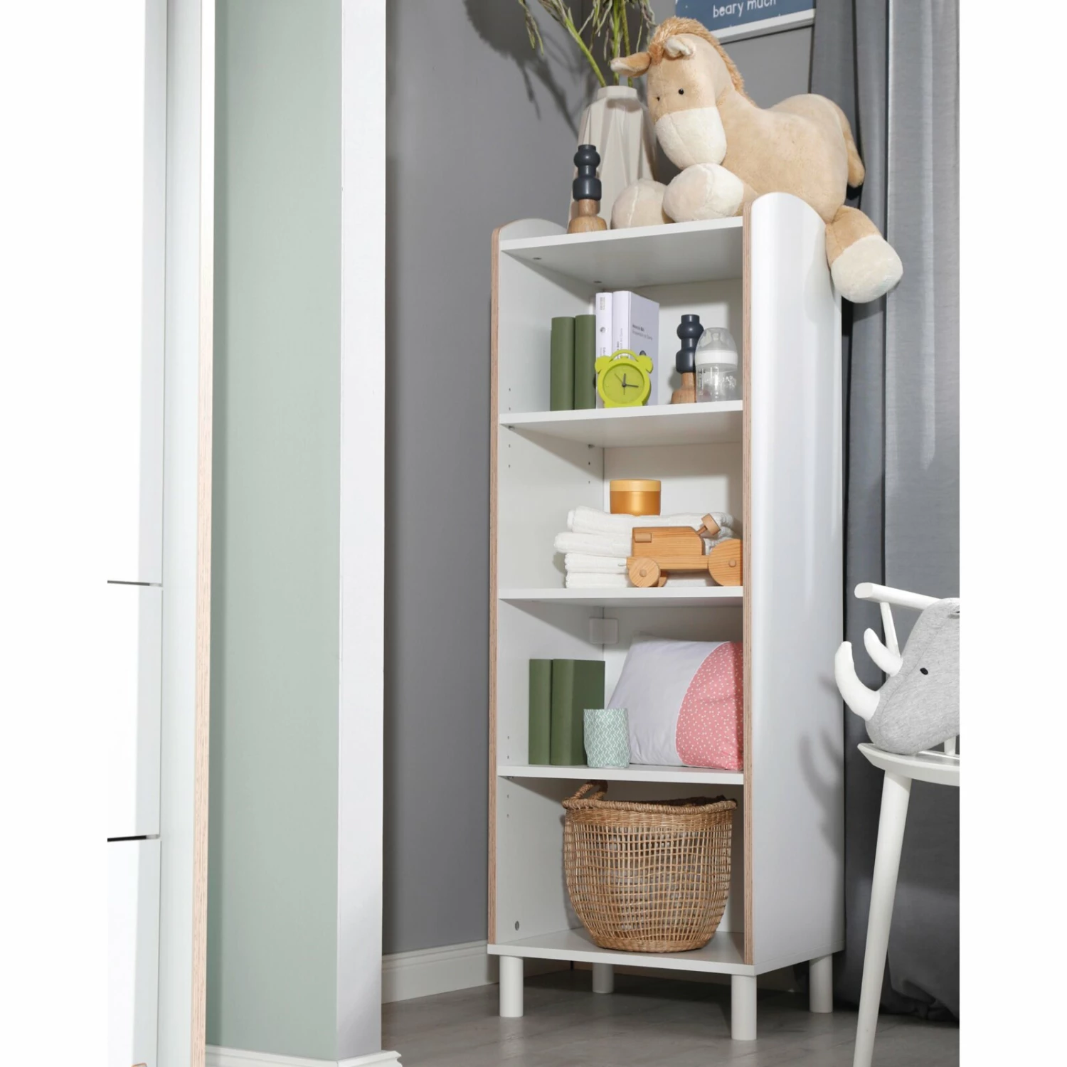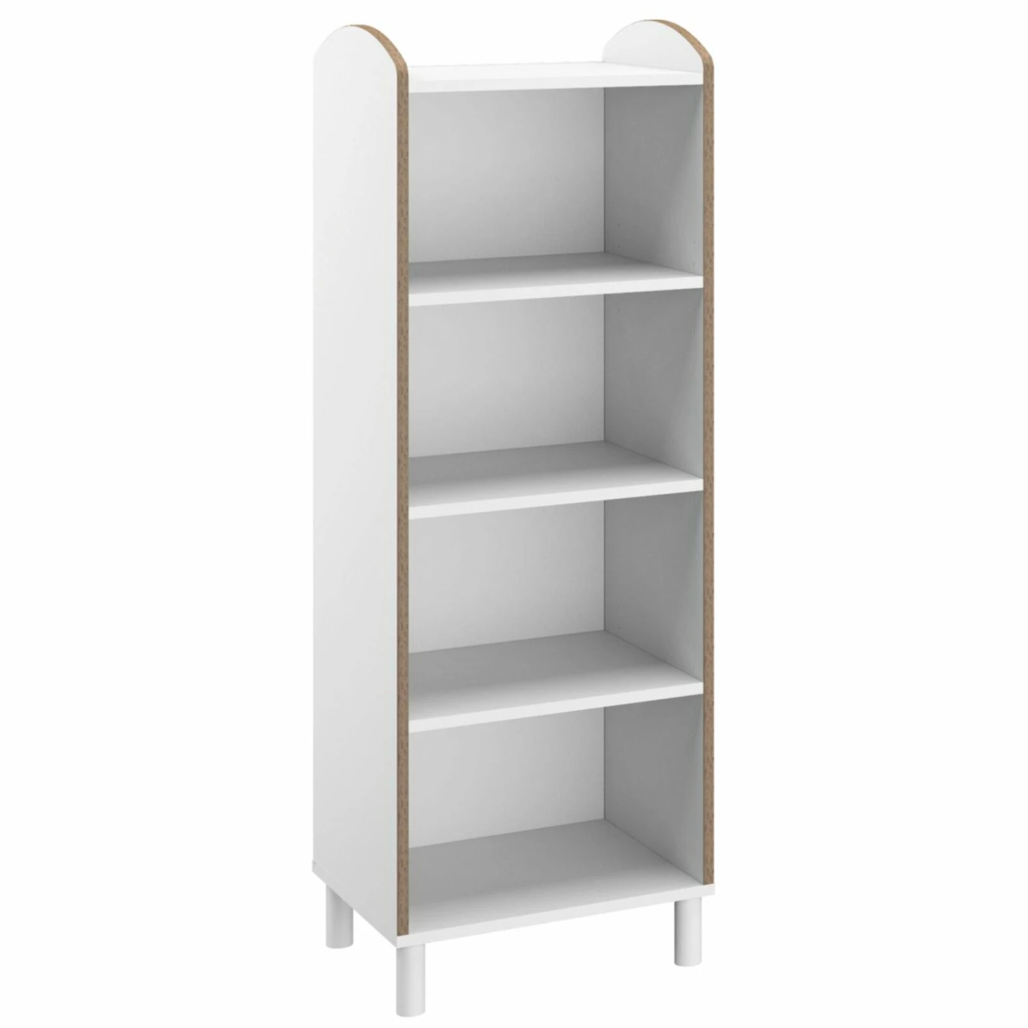Ein offenes Regal für Spielzeug und Co. Das Standregal präsentiert sich in Alpinweiß mit vier offenen Fächern. Mit einer Breite von etwa 47 Zentimetern und einer Höhe von 134 Zentimetern bietet es einiges an Stauraum.