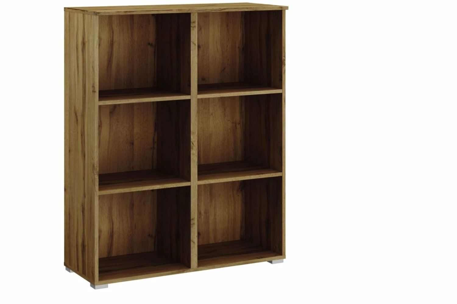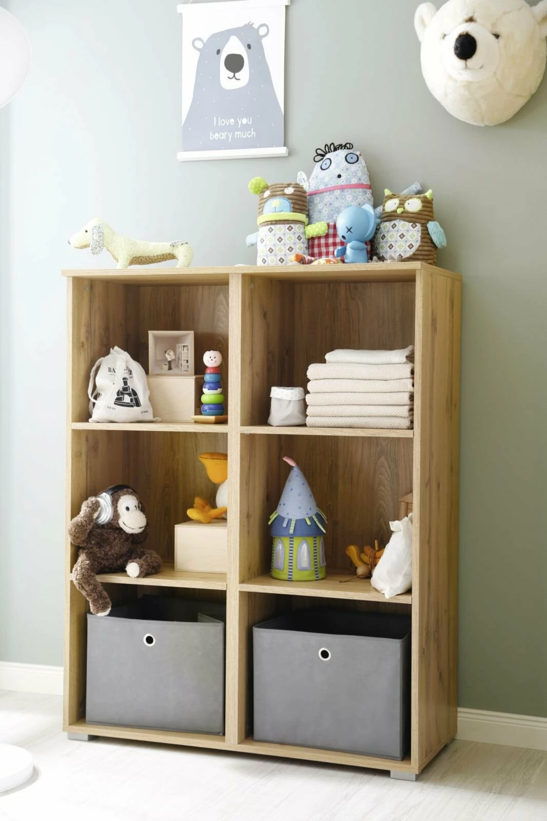Ein offenes Regal für Spielzeug und Co. Das Standregal präsentiert sich in Eiche Wotan Nachbildung mit vier Einlegeböden. Mit einer Breite von etwa 93 Zentimetern und einer Höhe von 119 Zentimetern bietet es einiges an Stauraum.