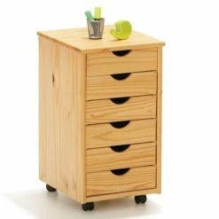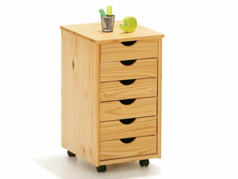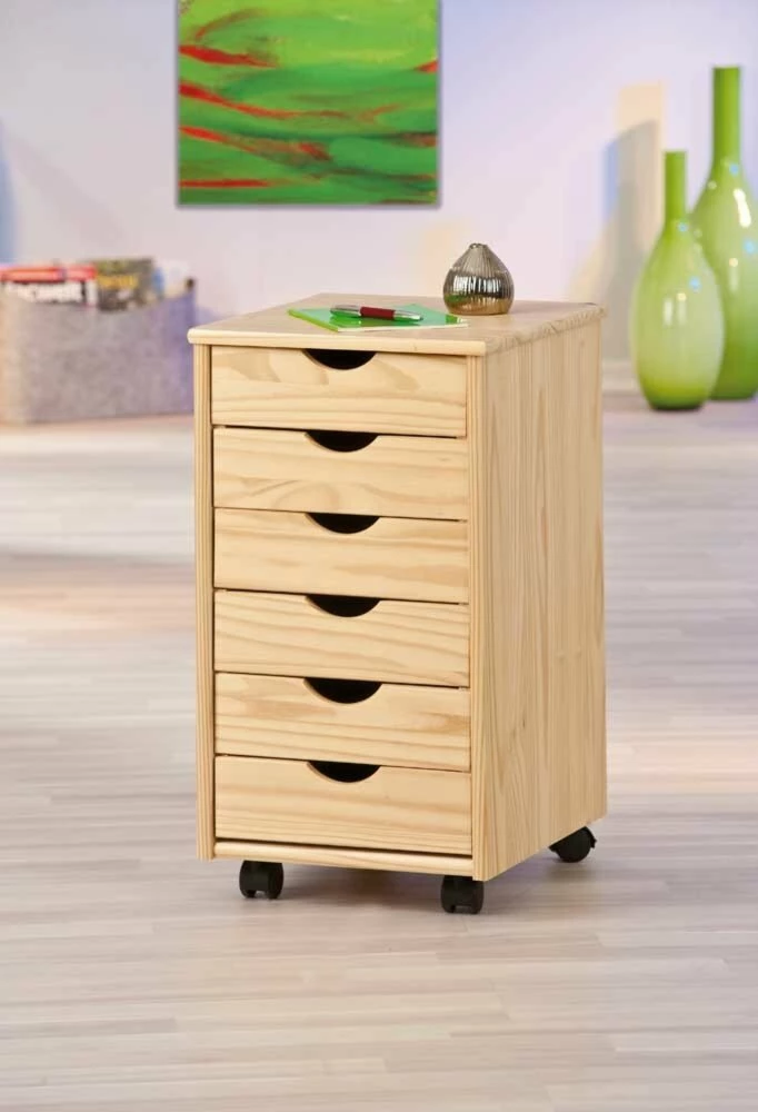 Der Rollcontainer ist ideal im Homeoffice oder Kinderzimmer. Durch die vier Kunststoffrollen können Sie den Container flexibel platzieren. In sechs Schubladen haben Sie reichlich Platz für beispielsweise Büromaterialien und Dokumente. Der Rollcontainer besteht aus Kiefer Massivholz, welches transparent lackiert wurde, so dass die natürlichen Holzmaserungen des Massivholzes wunderschön zur Geltung kommen.