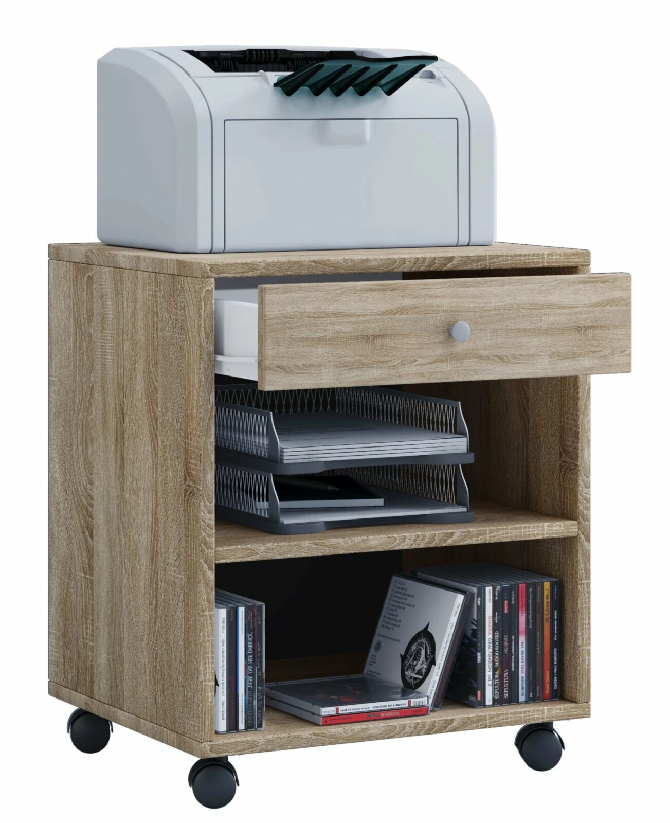Universell einsetzbarer Rollcontainer SALDA in der Ausführung Sonoma-Eiche Nachbildung. Dieser moderne Rollcontainer wird Ihnen den Büroalltag deutlich erleichtern. Er bietet Ihnen eine Schublade und zwei große Ablagefächer, um all Ihre Büroutensilien übersichtlich unterzubringen. Mit Hilfe der integrierten Rollen kann der Rollcontainer Ihren Wünschen nach platziert und jederzeit umgestellt werden. Ein wahrer Ordnungshüter für jede Art von Büro.