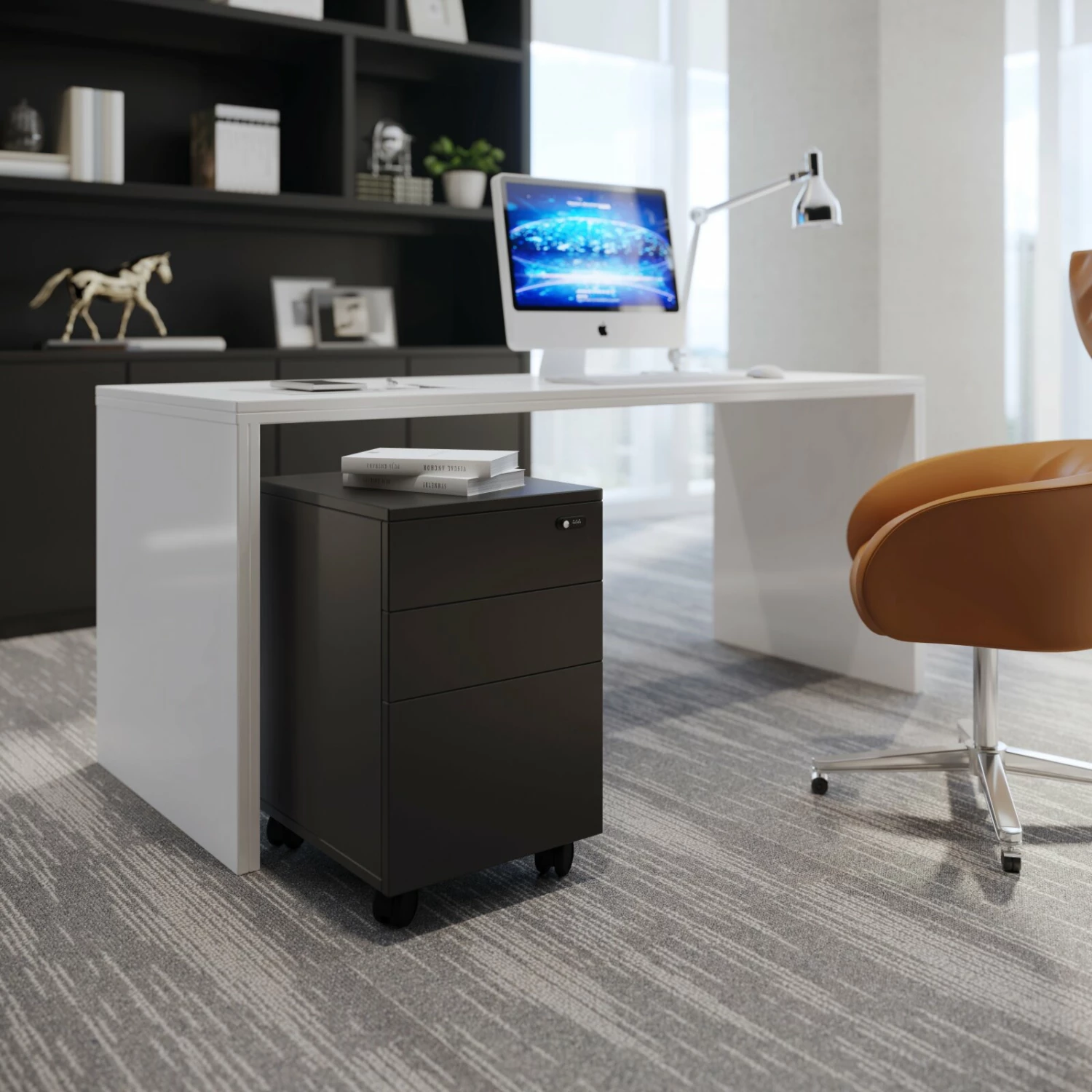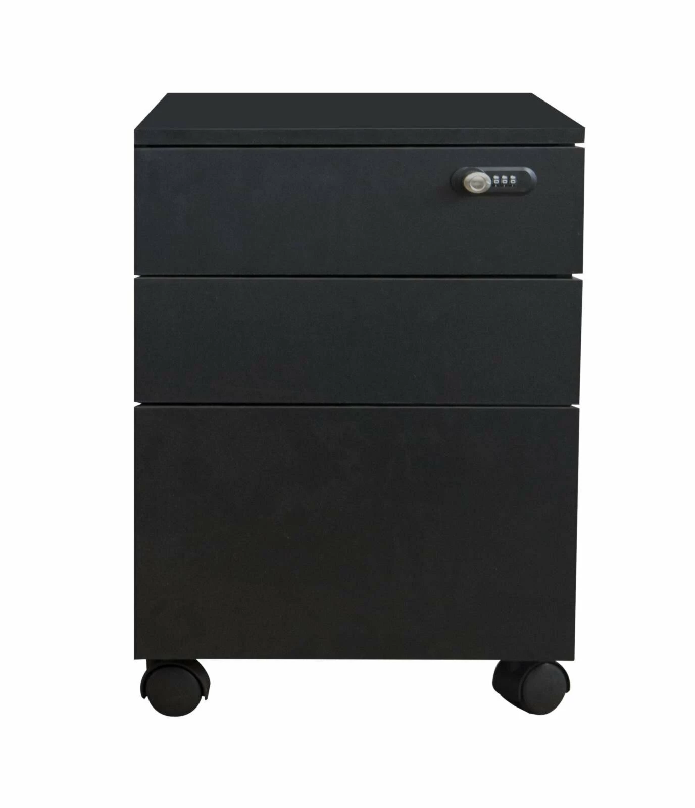 Der schwarze Rollcontainer ist eine praktische Stauraum-Lösung für dein Büro. Der Schrank kann ganz simpel unter deinem Schreibtisch gerollt werden und eignet sich bestens für deine Bürounterlagen und Büroutensilien. Falls wichtige Unterlagen oder Dokumente verstaut werden müssen, kannst du den Rollcontainer mittels Code-Schloss verschließen.
