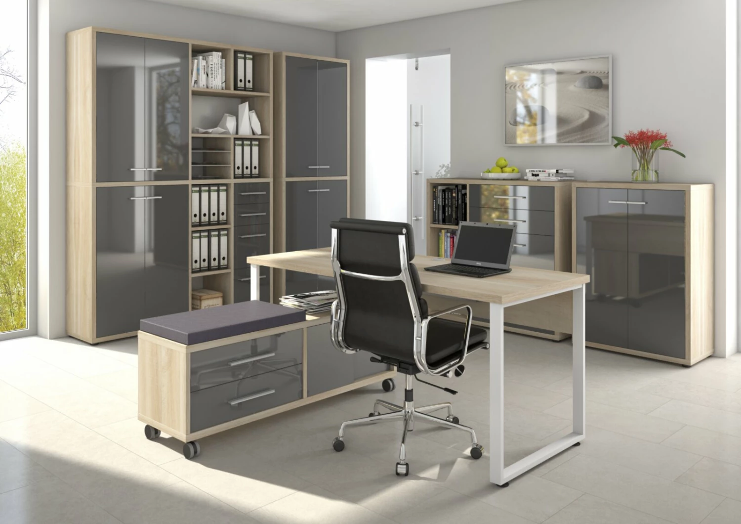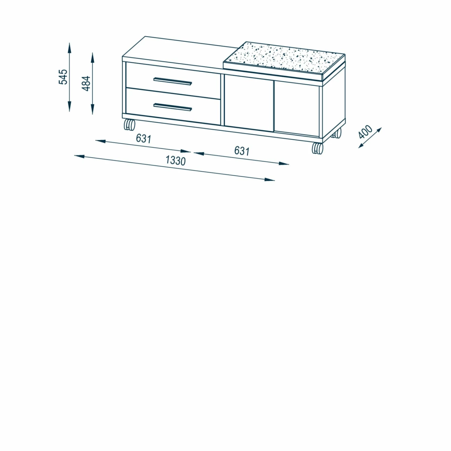 Rollcontainer SET+ mit Sitzkissen und hartbodentauglichen Rollen. Die grauen Fronten bestehen aus ESG-Sicherheitsglas und das Holz ist mit einer Melaminharzbeschichtung vor Kratzern geschützt. Der Container verfügt über zwei Schiebetüren und zwei Schubkästen, somit verfügen Sie über genügend Stauraum. Ein weiches Sitzkissen bietet die Möglichkeit sich auf dem Möbelstück gemütlich niederzulassen.
