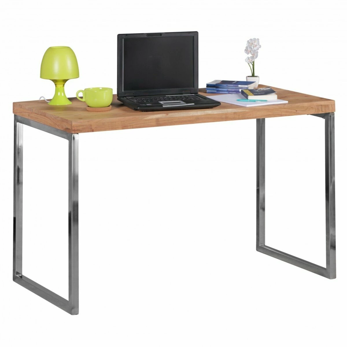 Toller Schreibtisch in geradlinigem warmen Design. Die Tischplatte weist eine einzigartige Maserung und Holzstruktur auf. Der in Handarbeit gefertigte Tisch ist durch die natürlichen und sichtbaren Bestandteile ein Unikat. Das verchromte Metallgestell an beiden Seiten ist ein toller Kontrast zum warmen Holzton.