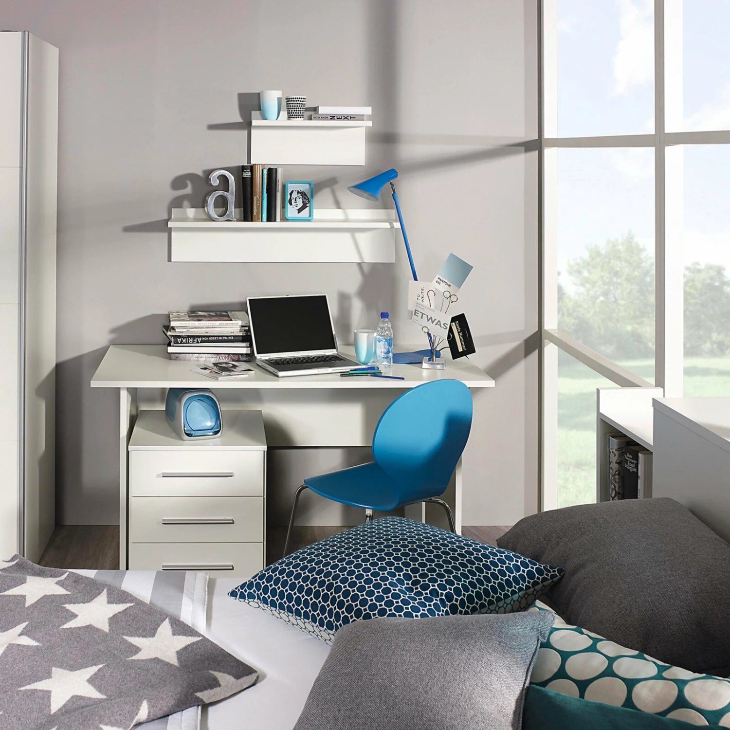 Der schlichte und geradlinige Schreibtisch lässt sich hervorragend in jedes Wohnambiente integrieren. Erledigen Sie von nun an Ihre Arbeit an diesem schicken Schreibtisch in Alpinweiß.