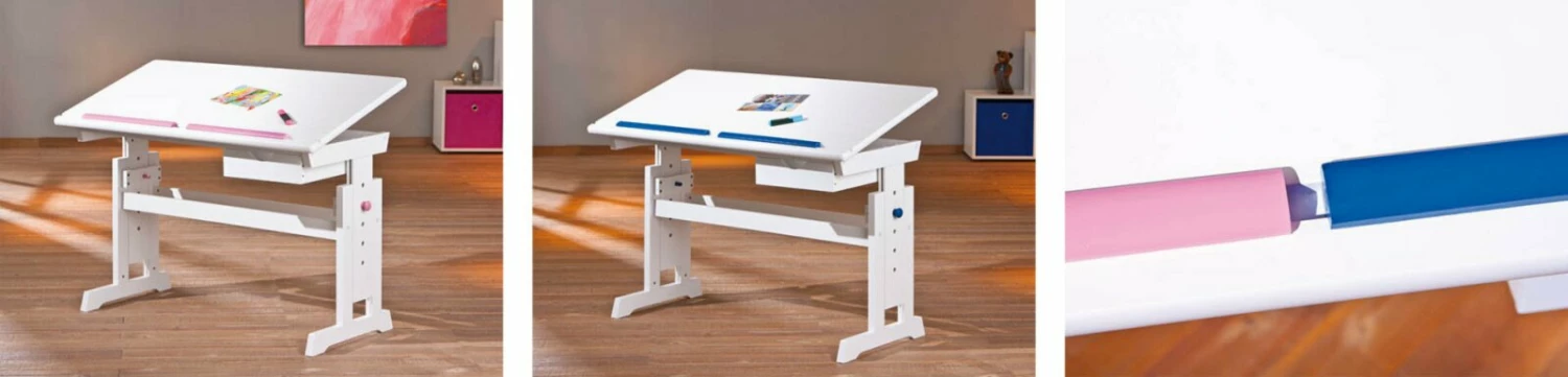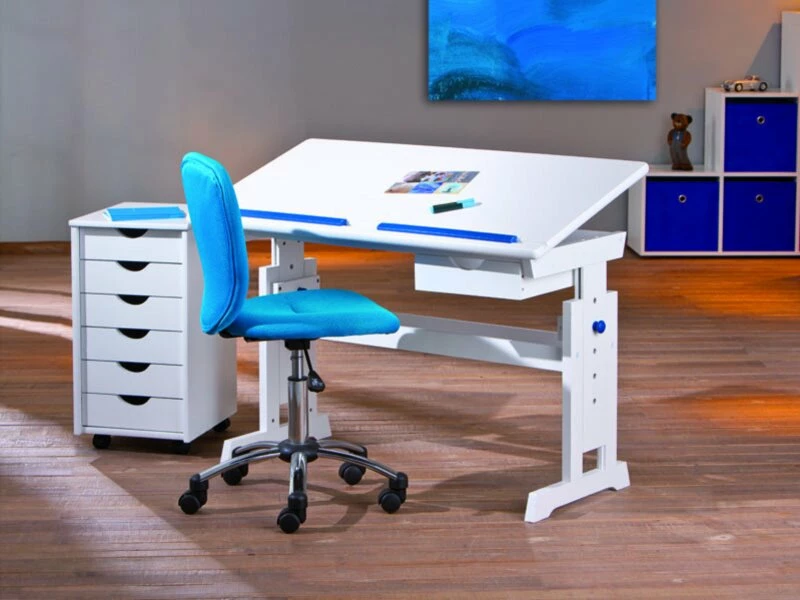 Der Schreibtisch BARU ist der optimale Platz, an dem du deine Hausaufgaben machen oder Bilder malen kannst. Er lässt sich praktischerweise in der Höhe verstellen und die Tischplatte lässt sich neigen.