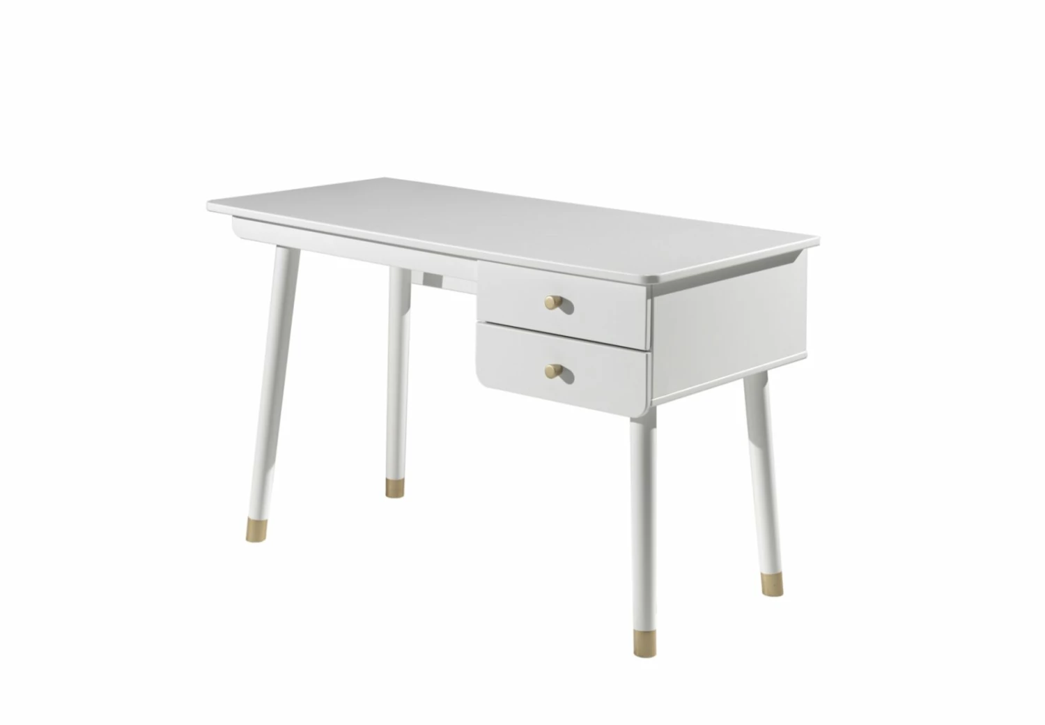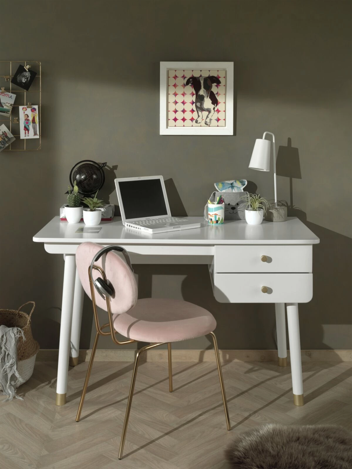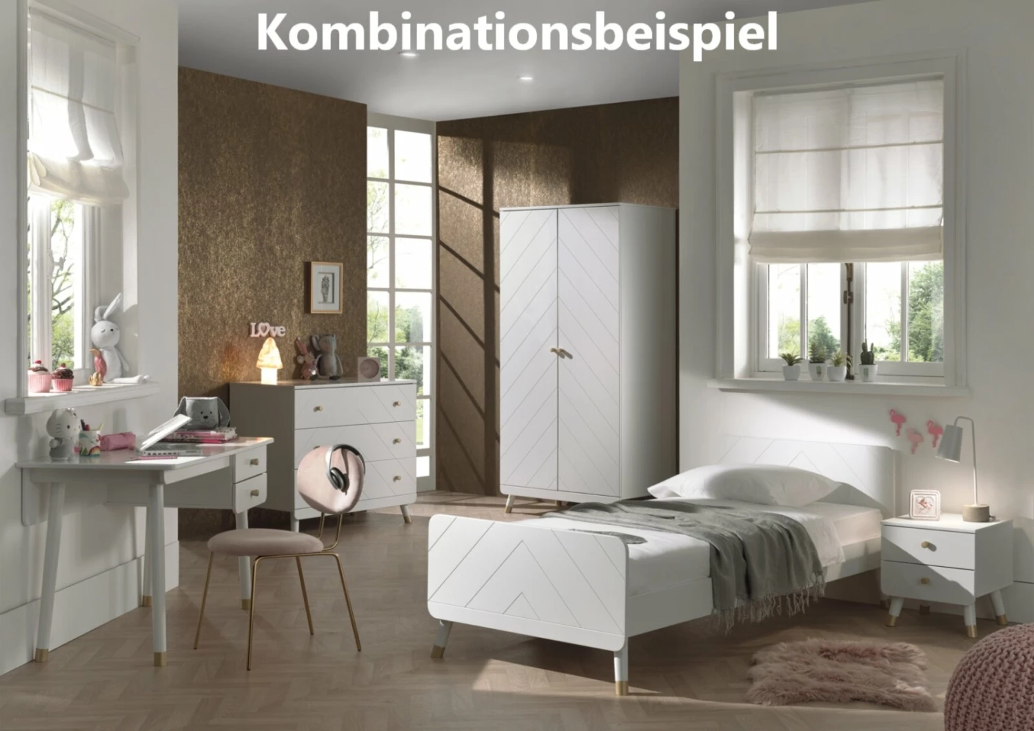Aus dem modernen Kinderzimmerprogramm BILLY präsentiert sich dieser etwas 125 Zentimeter breite Scheribtisch mit zwei praktischen Schubkästen. Das Besondere an diesem Tisch sind die goldfarbenen Applikationen, die ihn sehr edel wirken lassen.