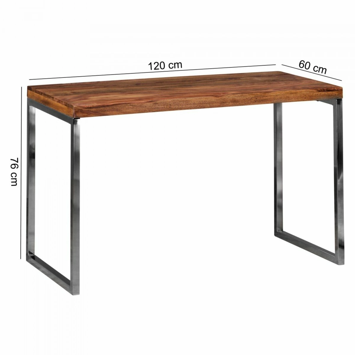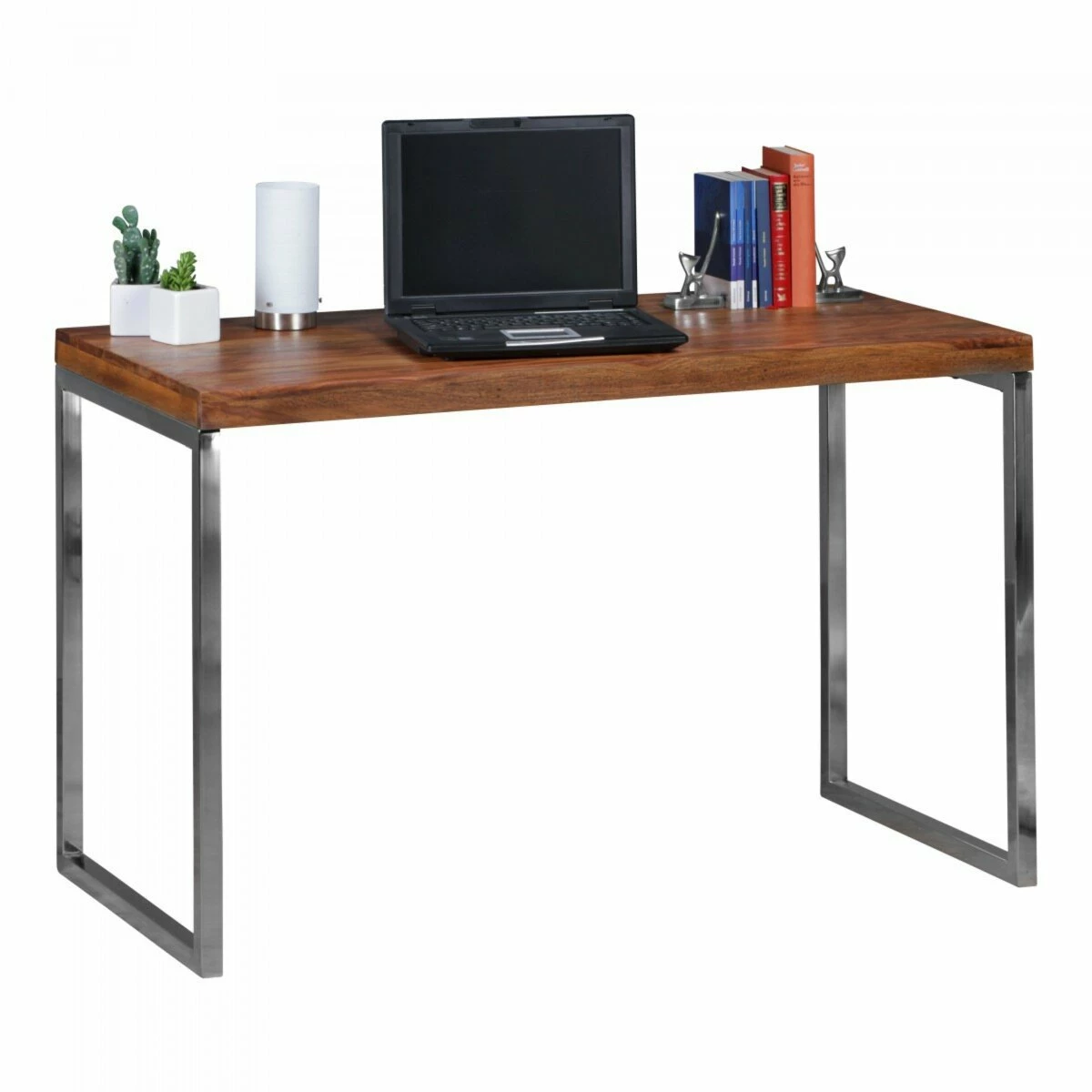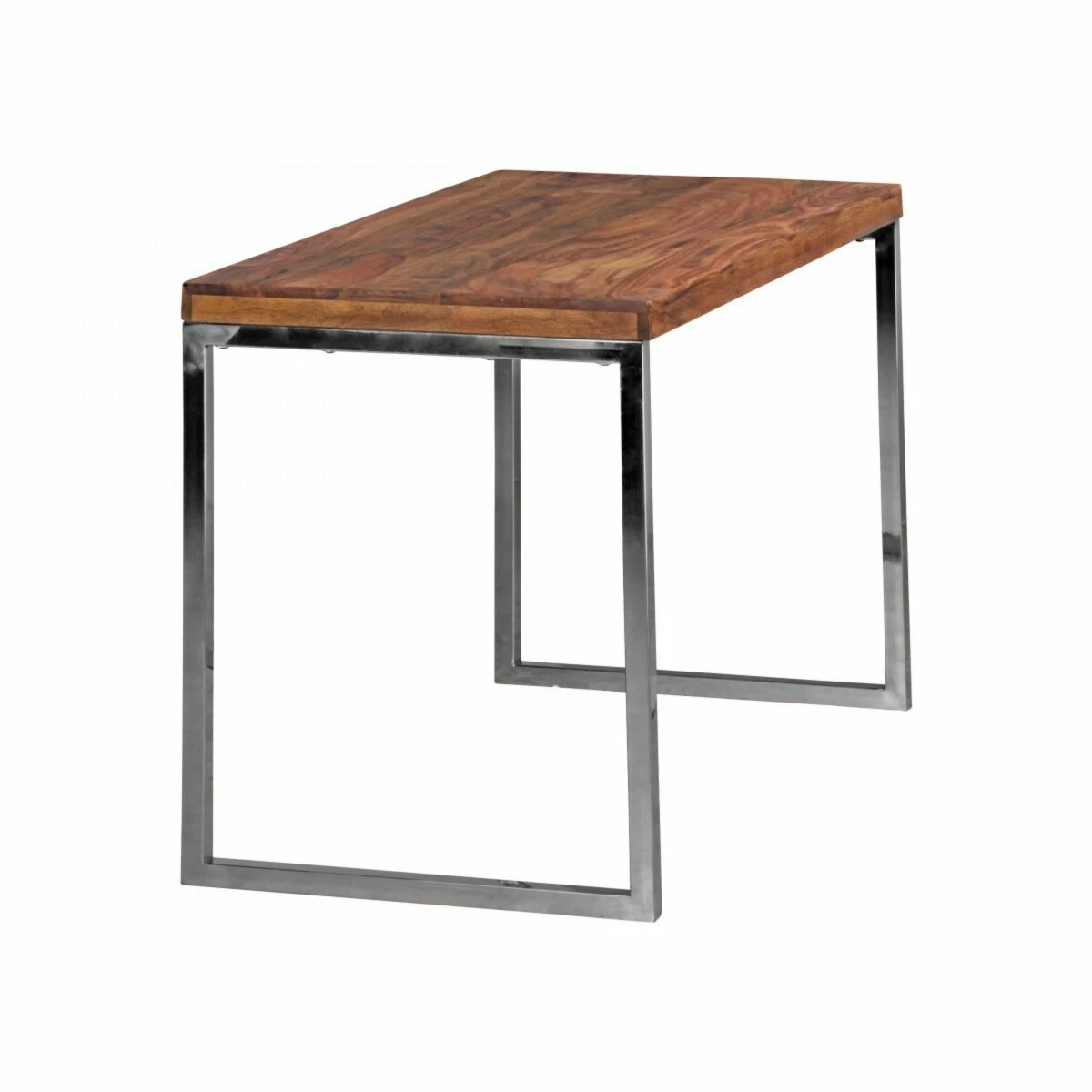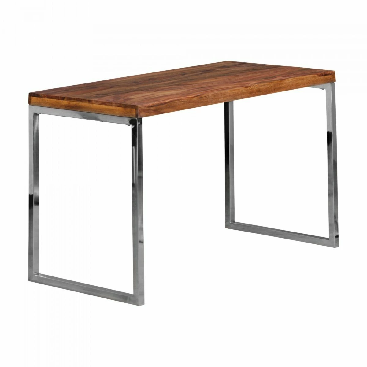 Toller Schreibtisch in geradlinigem warmen Design. Die Tischplatte weist eine einzigartige Maserung und Holzstruktur auf. Der in Handarbeit gefertigte Tisch ist durch die natürlichen und sichtbaren Bestandteile ein Unikat. Das verchromte Metallgestell an beiden Seiten ist ein toller Kontrast zum warmen Holzton.