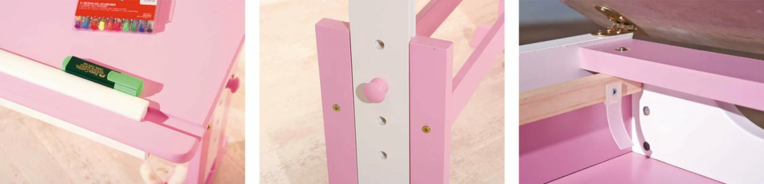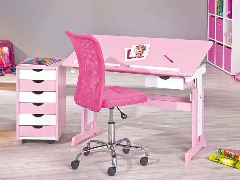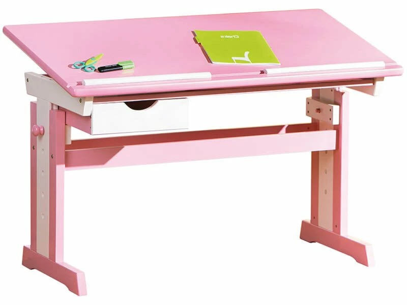 In einem prachtvollen Pink präsenteirt sich der etwa 109 cm breite Schreibtisch CECILIA. Hier lassen sich die Höhe und die Neigung der Tischplatte praktischerweise verstellen. Für Utensilien, die du stets griffbereit haben musst, bietet sich die Schublade bestens an.