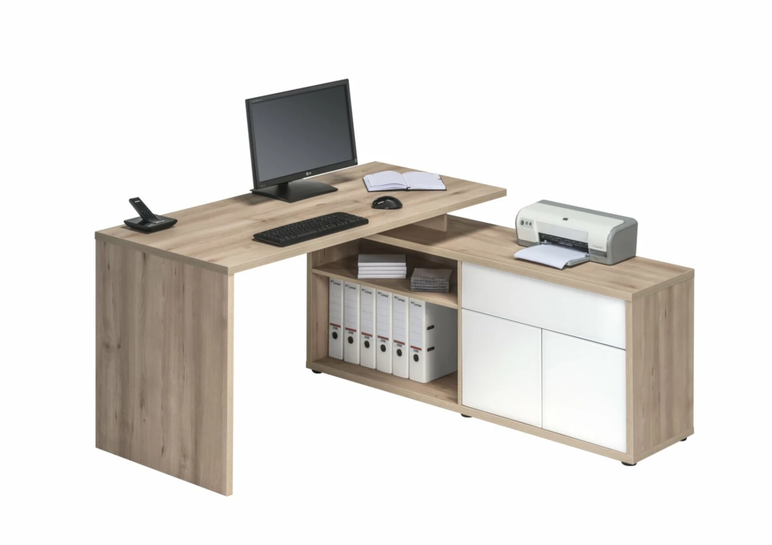 Dieser Schreib- und Computertisch bietet durch sein wechselseitig montierbares Schreibtischelement jede Menge Stauraummöglichkeiten für Ihre Büroutensilien und fügt sich trotzdem nahtlos in jeden Raum ein.