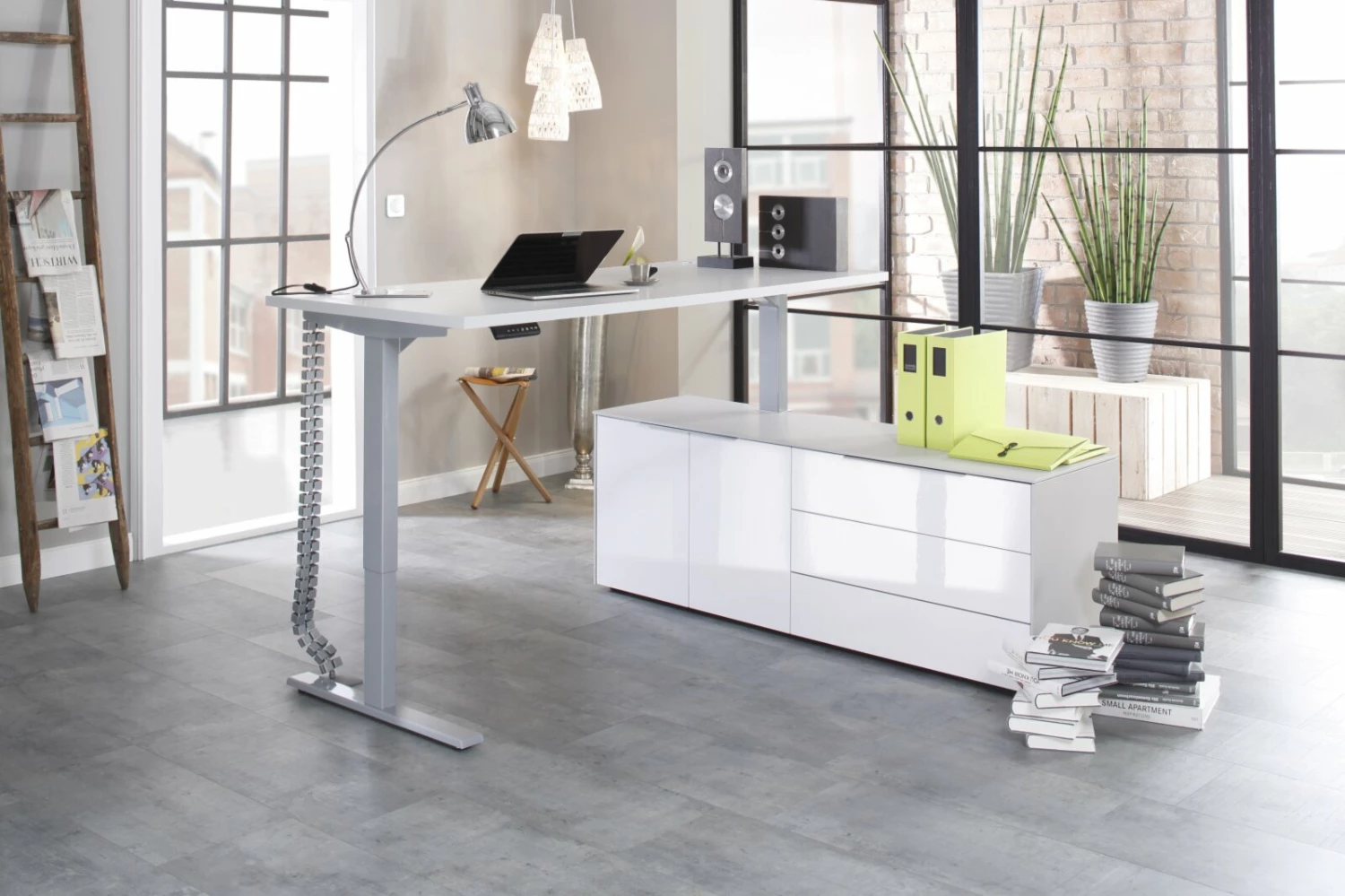 Absolut rückenschonend – der Schreibtisch mit elektrischer Höhenverstellung. Per Knopfdruck setzt sich das 2-Motoren-Gestell in Bewegung und zeigt Ihnen auf einem kleinen Display die genau Höhe an. Arbeiten Sie im Sitzen oder im Stehen und speichern mit der Memoryfunktion bis zu vier verschiedene Einstellungen um lästiges neuarretieren zu verhindern. So haben Sie im handumdrehen die perfekte Arbeitshöhe. Optisch fügt er sich in viele Wohnstile ein.