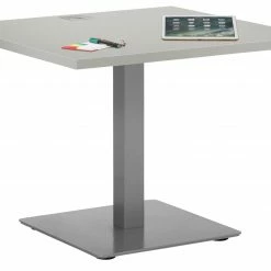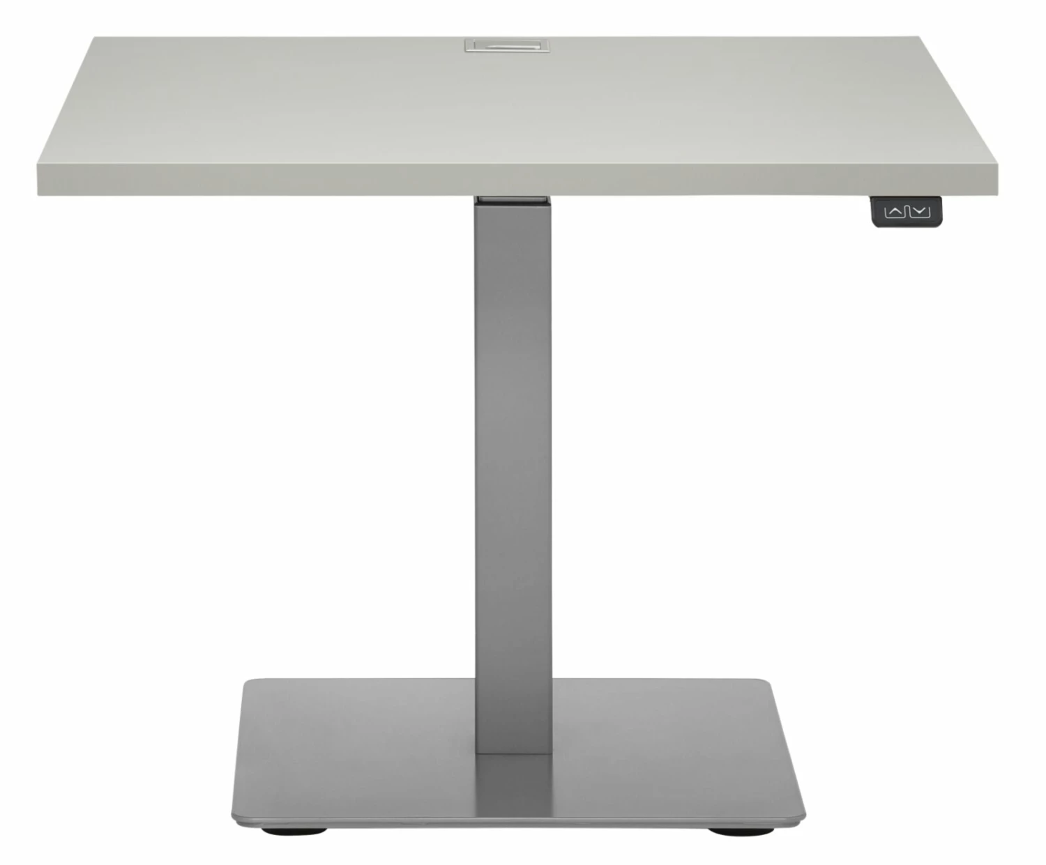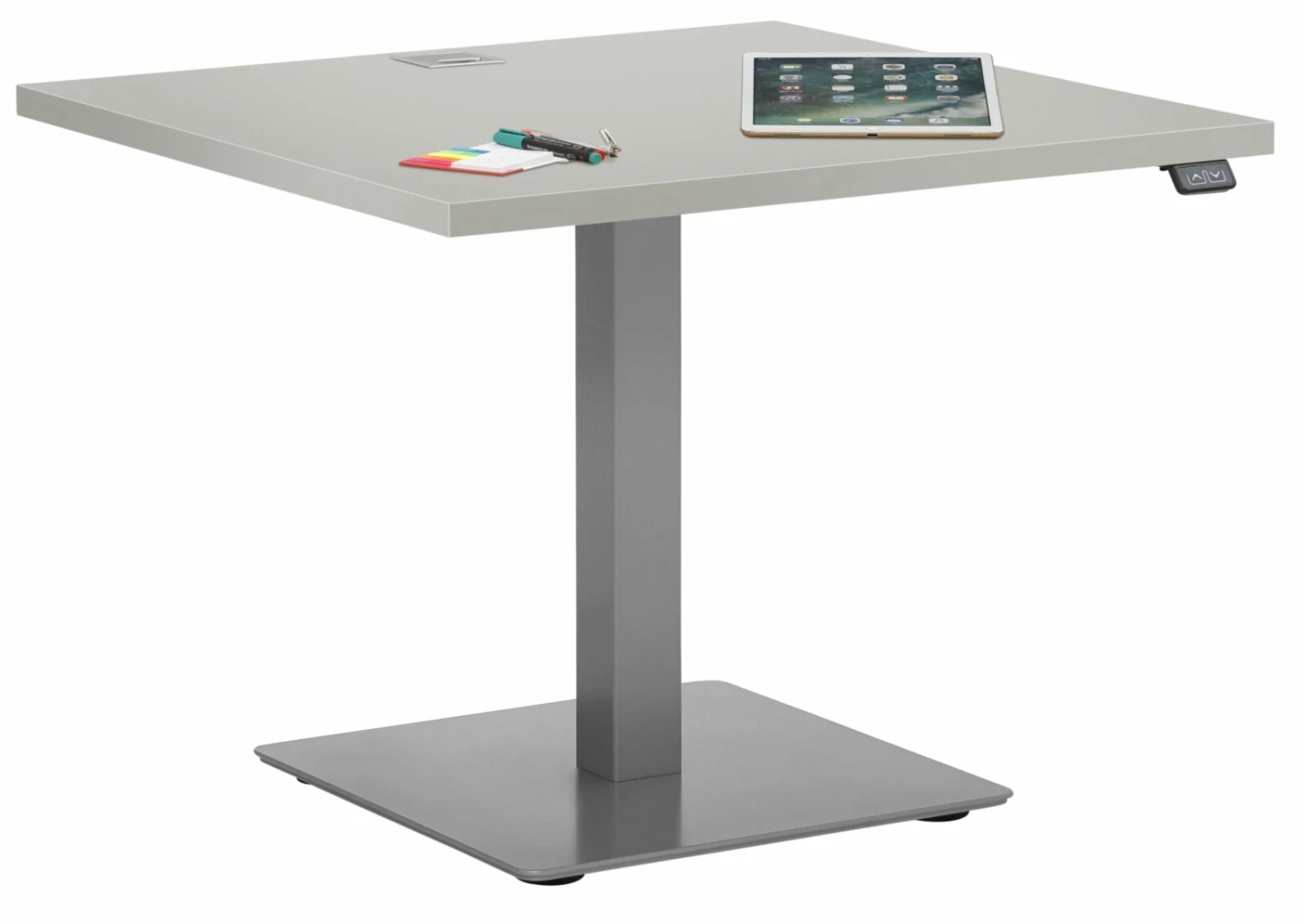 Der höhenverstellbare Schreibtisch in Platingrau mit einem Gestell aus Metall hat eine kompakte Größe von etwa 80 x 80 Zentimetern und eignet sich nicht nur als hervorragende kleine Einzellösung, sondern auch als Ergänzungstisch an großen Schreibtischen. Durch eine stufenlose Höhenverstellung ist das Arbeiten an diesen Schreibtischen besonders ergonomisch und individuell anpassbar.