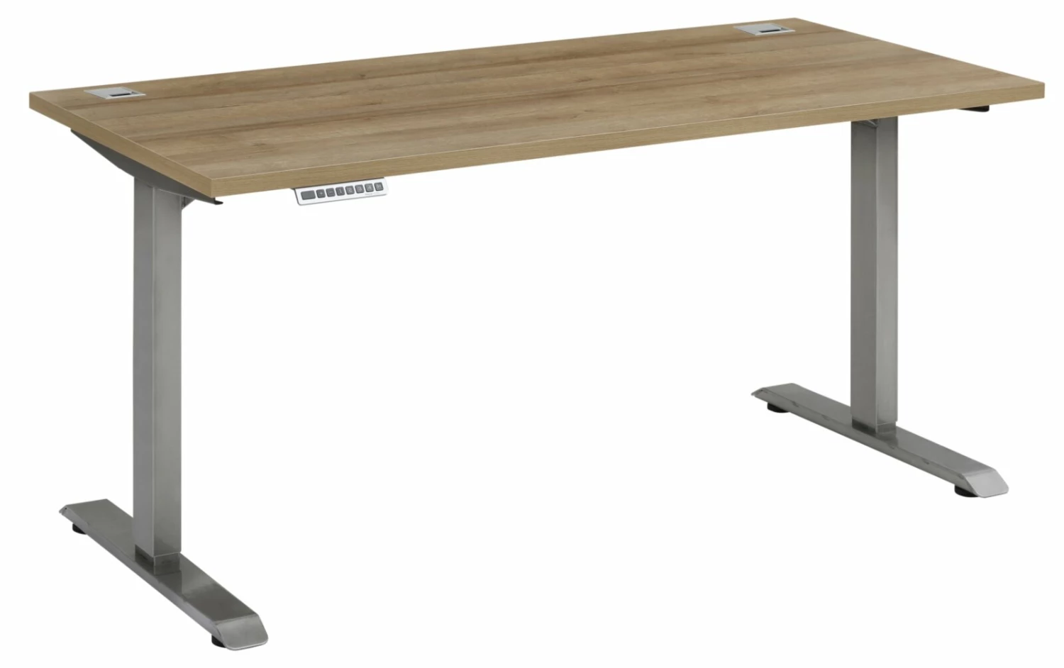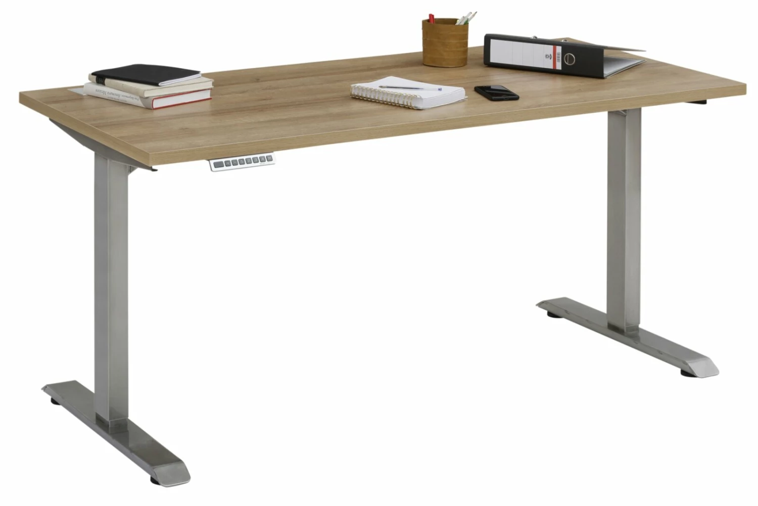 Der Schreibtisch ist durch seine Funktion sehr komfortabel. Er lässt sich mit Hilfe eines 2-Motoren-Gestells in der Höhe verstellen. So können Sie nicht nur am Tisch sitzen, sondern auch stehen und ihn auf Ihre Körpergröße anpassen. Der Clou – eine Memoryfunktion die es Ihnen ermöglicht, bis zu vier Höheneinstellungen zu speichern. Auch ein Display mit einer genauen Anzeige befindet sich am Gestell. ABS-Kanten machen den Tisch, ebenso wie die Melaminharzbeschichtung, robust. Außerdem überzeugt der Tisch mit seiner Optik! Die Tischplatte in Riviera Eiche Nachbildung harmoniert mit dem Gestell aus Metall hervorragend.