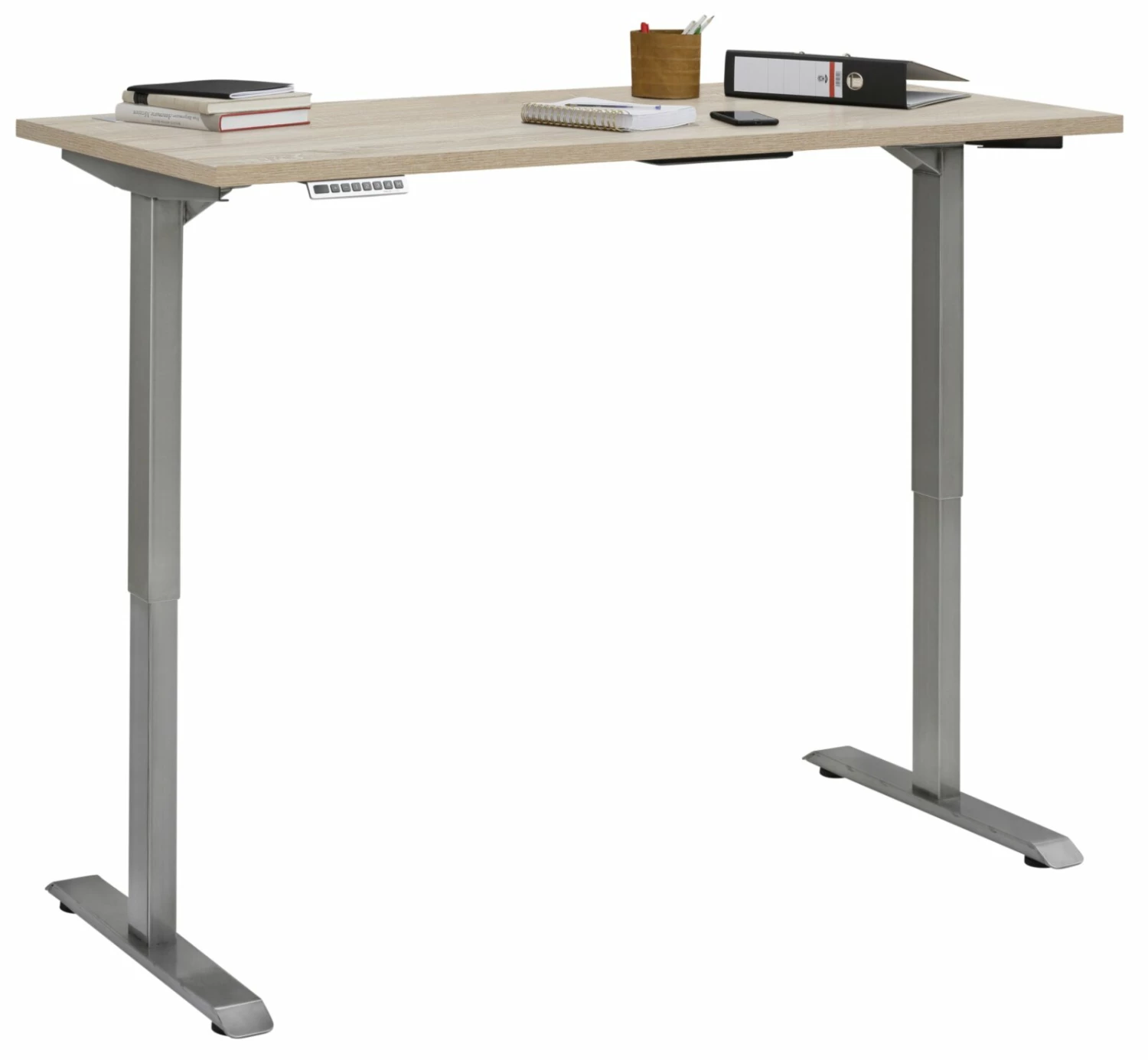 Der Schreibtisch ist durch seine Funktion sehr komfortabel. Er lässt sich mit Hilfe eines 2-Motoren-Gestells in der Höhe verstellen. So können Sie nicht nur am Tisch sitzen, sondern auch stehen und ihn auf Ihre Körpergröße anpassen. Der Clou – eine Memoryfunktion die es Ihnen ermöglicht, bis zu vier Höheneinstellungen zu speichern. Auch ein Display mit einer genauen Anzeige befindet sich am Gestell. ABS-Kanten machen den Tisch, ebenso wie die Melaminharzbeschichtung, robust. Außerdem überzeugt der Tisch mit seiner Optik! Die Tischplatte in Sonoma Eiche Nachbildung harmoniert mit dem Gestell aus Metall hervorragend.