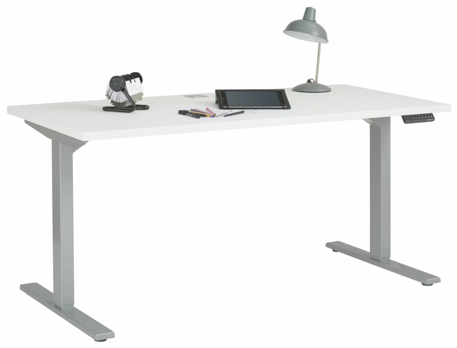 Der Schreibtisch ist durch seine Funktion sehr komfortabel. Er lässt sich mit Hilfe eines 2-Motoren-Gestells in der Höhe verstellen. So können Sie nicht nur am Tisch sitzen, sondern auch stehen und ihn auf Ihre Körpergröße anpassen. Der Clou – eine Memoryfunktion die es Ihnen ermöglicht, bis zu vier Höheneinstellungen zu speichern. Auch ein Display mit einer genauen Anzeige befindet sich am Gestell. ABS-Kanten machen den Tisch, ebenso wie die Melaminharzbeschichtung, robust. Außerdem überzeugt der Tisch mit seiner Optik! Die Tischplatte in Weiß matt harmoniert mit dem pulverbeschichtetem Gestell in Platingrau hervorragend.