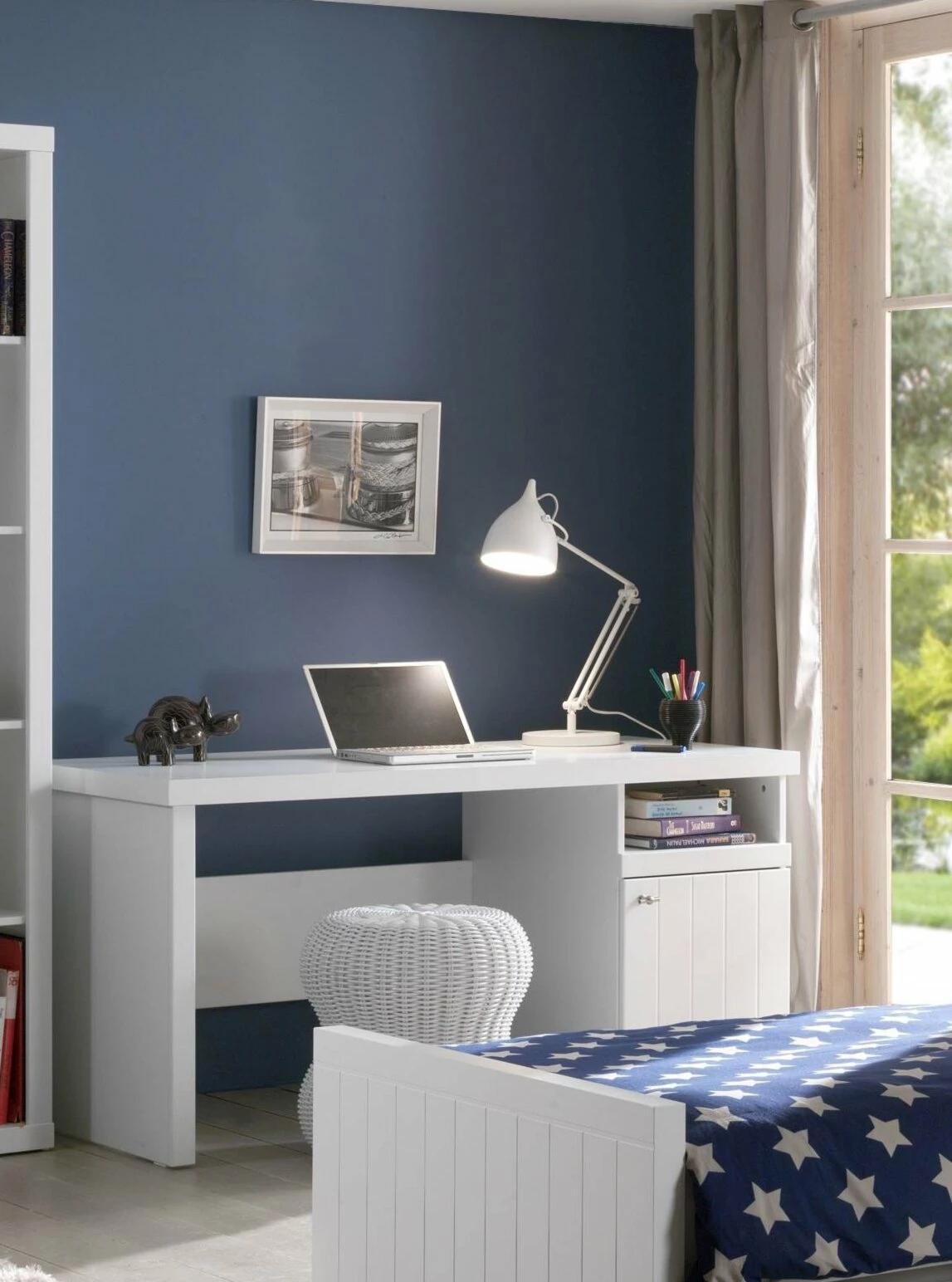Der Schreibtisch ROBIN präsentiert sich in beliebter Landhaus-Optik. Er hat besonders dicke Seitenwangen und Arbeitsplatte, ca. 58 mm stark, welche für die nötige Standfestigkeit und Stabilität sorgen. Das Holz mit typischer Rillenfräsung ist weiß lackiert. Die Tür hat durch die Fräsungen eine geplankte Optik. Darüber ein praktisches Ablagefach für Bücher oder Arbeitsutensilien.