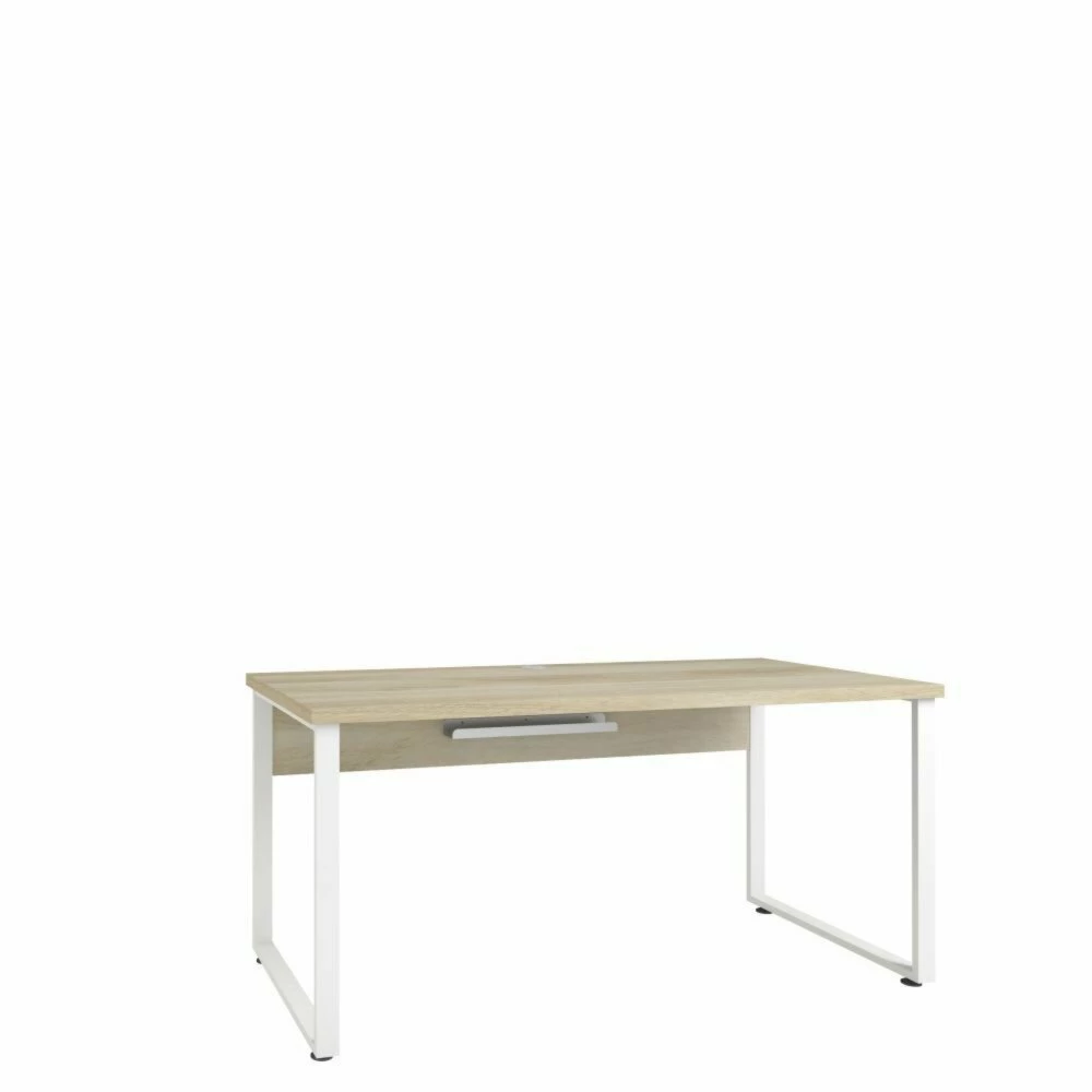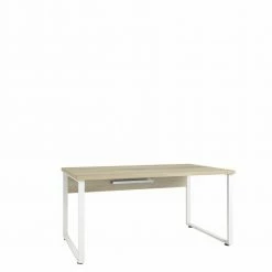 Schreibtisch SET+ mit praktischer Kabeldurchführung und Kabelablage. Die Eiche Optik lässt sich vielseitig kombinieren und verleiht dem Schreibtisch ein stivolles Design. Eine Melaminharzbeschichtung schützt die Oberfläche vor Kratzern. Das weiße Metallgestell sorgt für Standfestigkeit und macht den Tisch zum stilvollen Highlight.