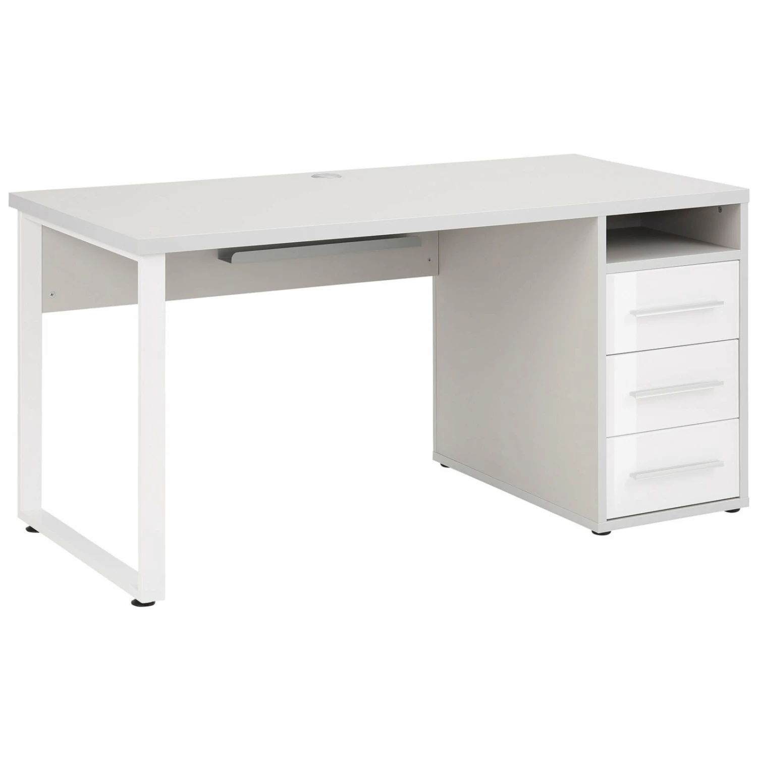 Schreibtisch SET+ in Platingrau mit Weißglas abgesetzt. Drei Schubkästen und drei Ablagefächer bieten Platz für Schreibutensilien und Unterlagen. Die Oberflächen sind mit Melaminharzbeschichtung vor Kratzern geschützt und dank der Kabeldurchführung und -Ablage platzieren Sie Ihre Kabel unauffällig und sicher. Der Schreibtisch ist wechselseitig montierbar und lässt sich somit in jedem Arbeitszimmer aufstellen.