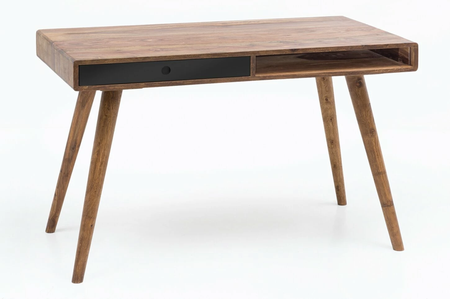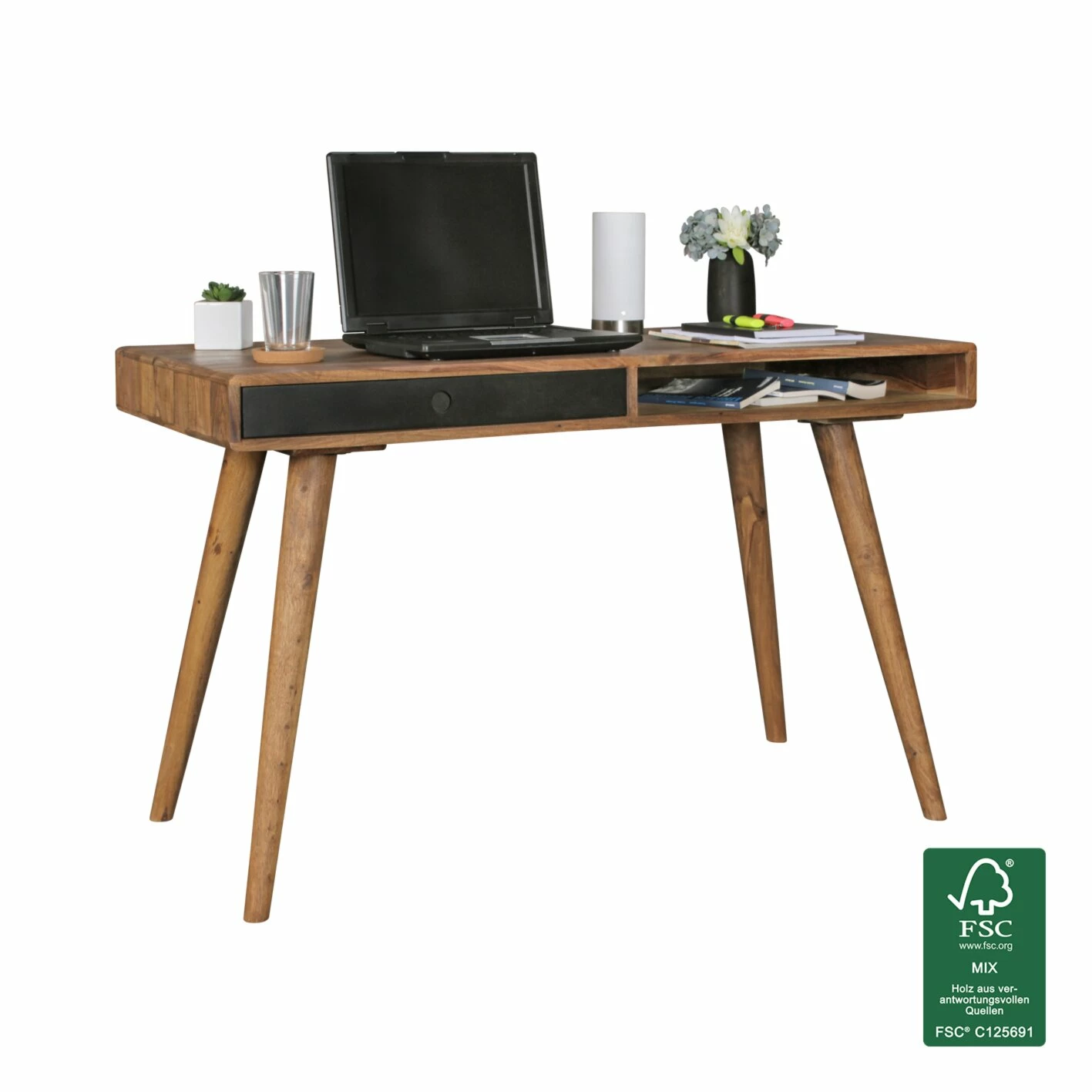 Dieser Schreibtisch ist in einem angesagten Retro-Look gehalten und bringt modernes Design in Ihre Arbeitswelt. Die großzügige Tischplatte erleichtert das Arbeiten und wird durch zusätzlichen Stauraum ergänzt. Eine Schublade und ein offenes Ablagefach bieten Raum für Büroutensilien und Unterlagen. Der Schreibtisch ist aus massivem Sheesham gefertigt und die Schublade wurde in Schwarz farblich abgesetzt. Bei dem Material handelt es sich um FSC zertifizierte Ware. Schublade ist dank Metallbeschlägen leichtläufig. Da es sich um ein Naturprodukt handelt ist jedes Teil ein Unikat.